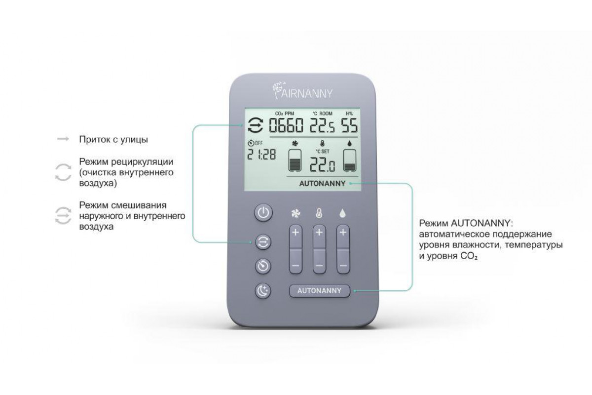 В режиме AutoNanny устройство автоматически выбирает нужный режим работы. Если уровень CO₂ превышает 600 ppm, система активирует приток свежего воздуха. Как только параметры приходят в норму, включается фильтрация внутреннего воздуха — вы даже не заметите, как микроклимат всегда остаётся идеальным.