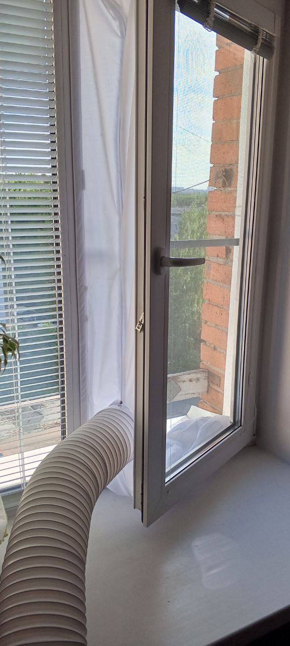 Отводящий гофрошланг встраивается в оконный проем с помощью нехитрого механизма или опускается в открытое окно или форточку. Второй вариант менее предпочтителен, поскольку из окна в жаркую погоду поступает теплый воздух, соответственно, идет снижение эффективности охлаждения, а затраты электроэнергии вырастают.