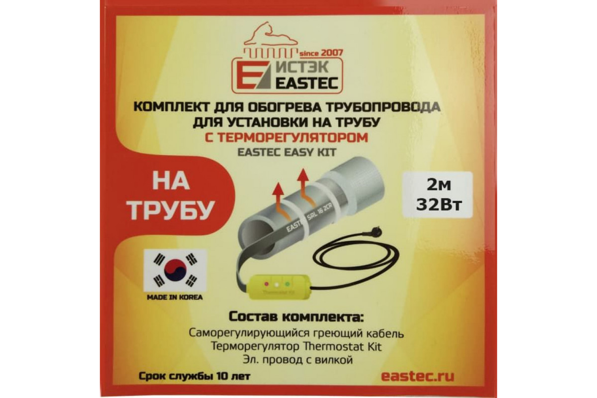 EK-02 EASTEC комплект для обогрева трубопровода(2м-32 Вт) идеально подходит для обогрева водопроводных и канализационных труб, а также систем водоснабжения на открытом воздухе, в неотапливаемых помещениях, на дачах и в загородных домах.
