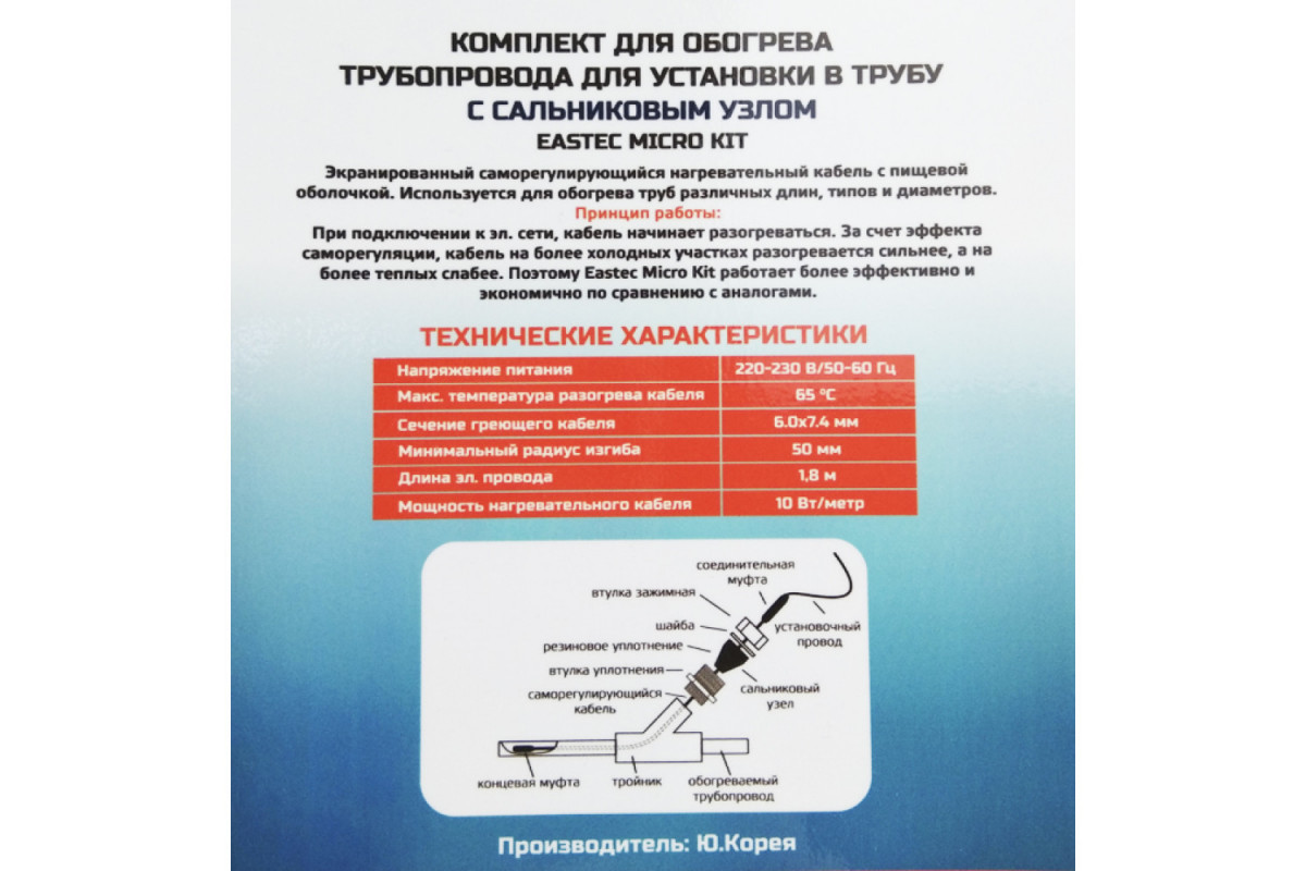 EMK-12 EASTEC комплект обогрева трубопровода для установки в трубу (12м-120 Вт) идеально подходит для использования в системах водоснабжения, включая: