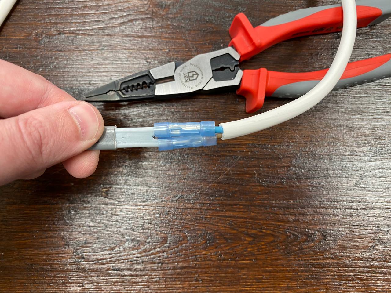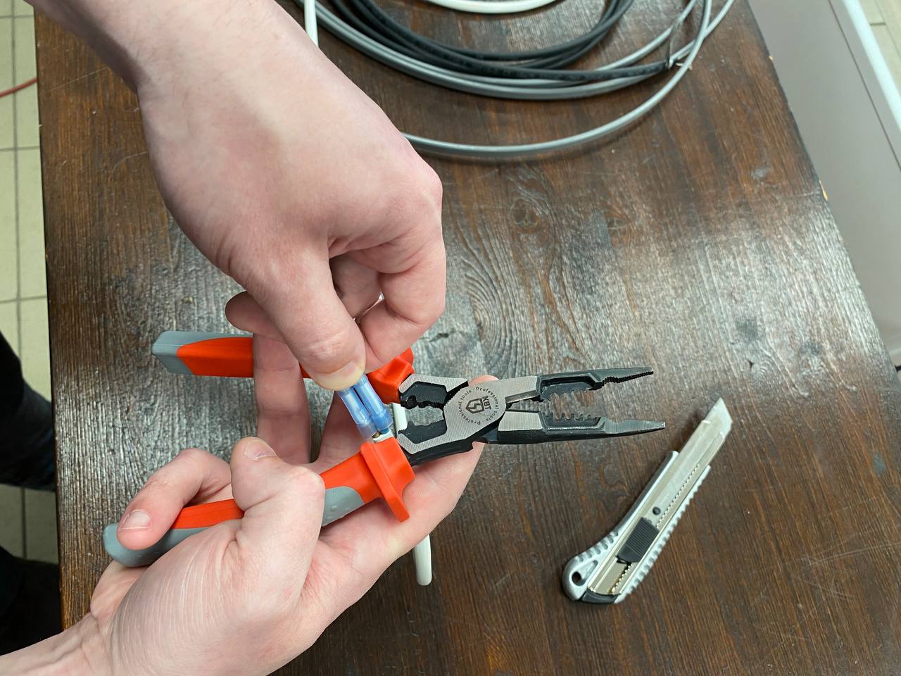- Обжимаем все соединения инструментом. Подойдут пассатижи или бокорезы. После обжатия удостоверьтесь что кабель надежно и плотно закреплен.