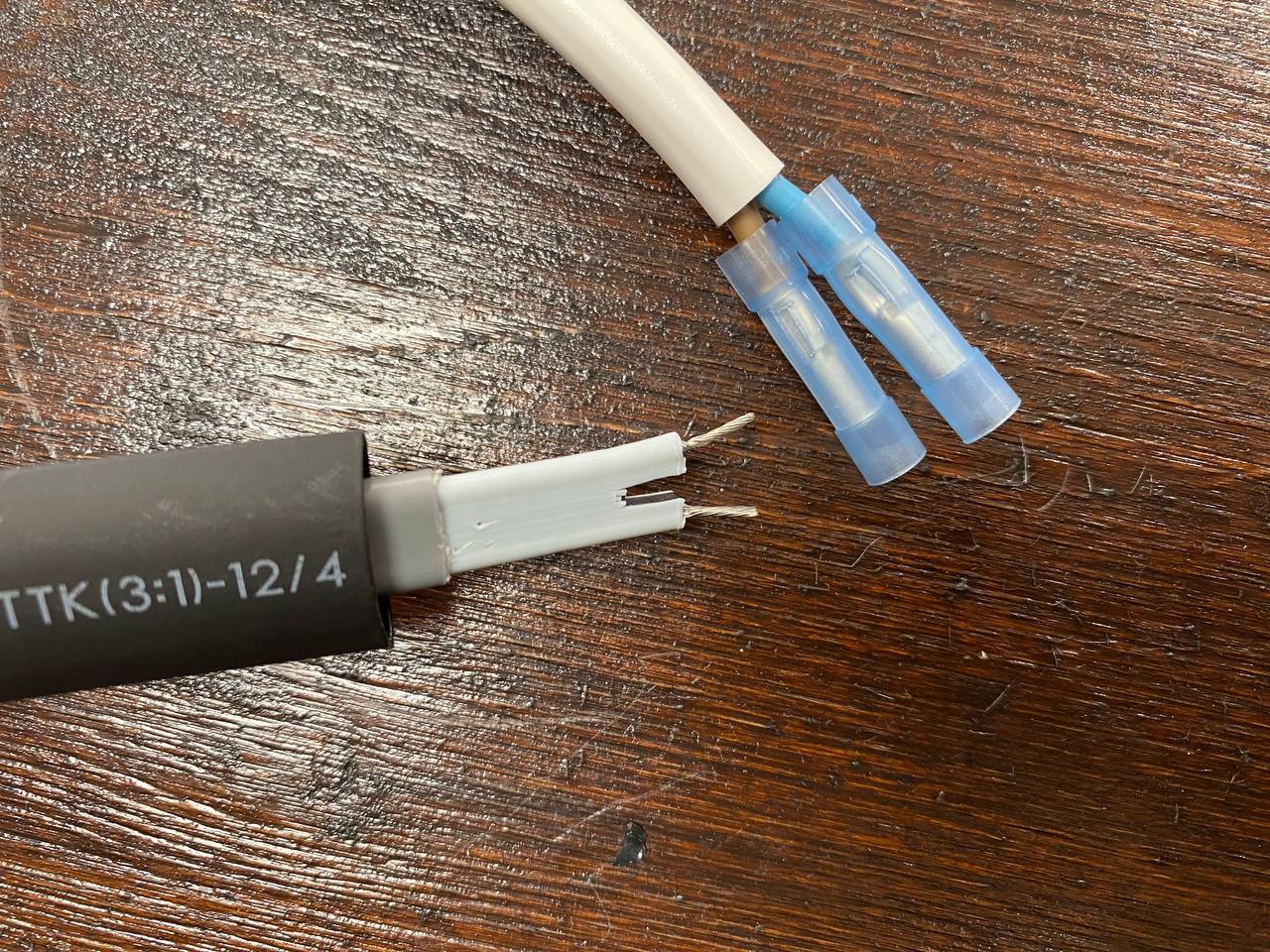 - Укоротим жилы до нужной длинны под зажимную гильзу. Мы используем гильзы ГСИ(н) 2,5 изолированные в нейлоновом корпусе. Заранее наденем термоусадочную муфту, что бы не забыть =) муфты используем ТТК (3:1)-12/4 (с клеевым слоем, это обязательно!)