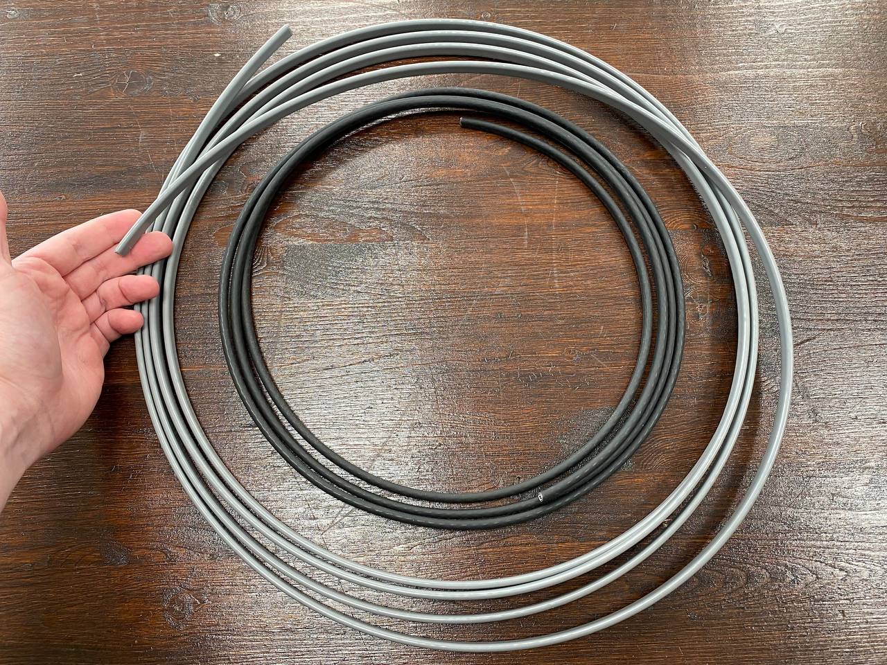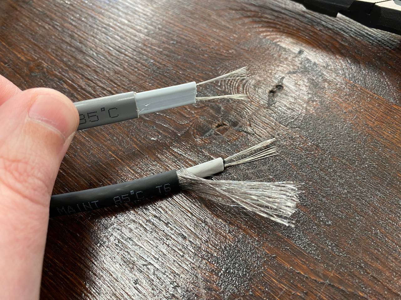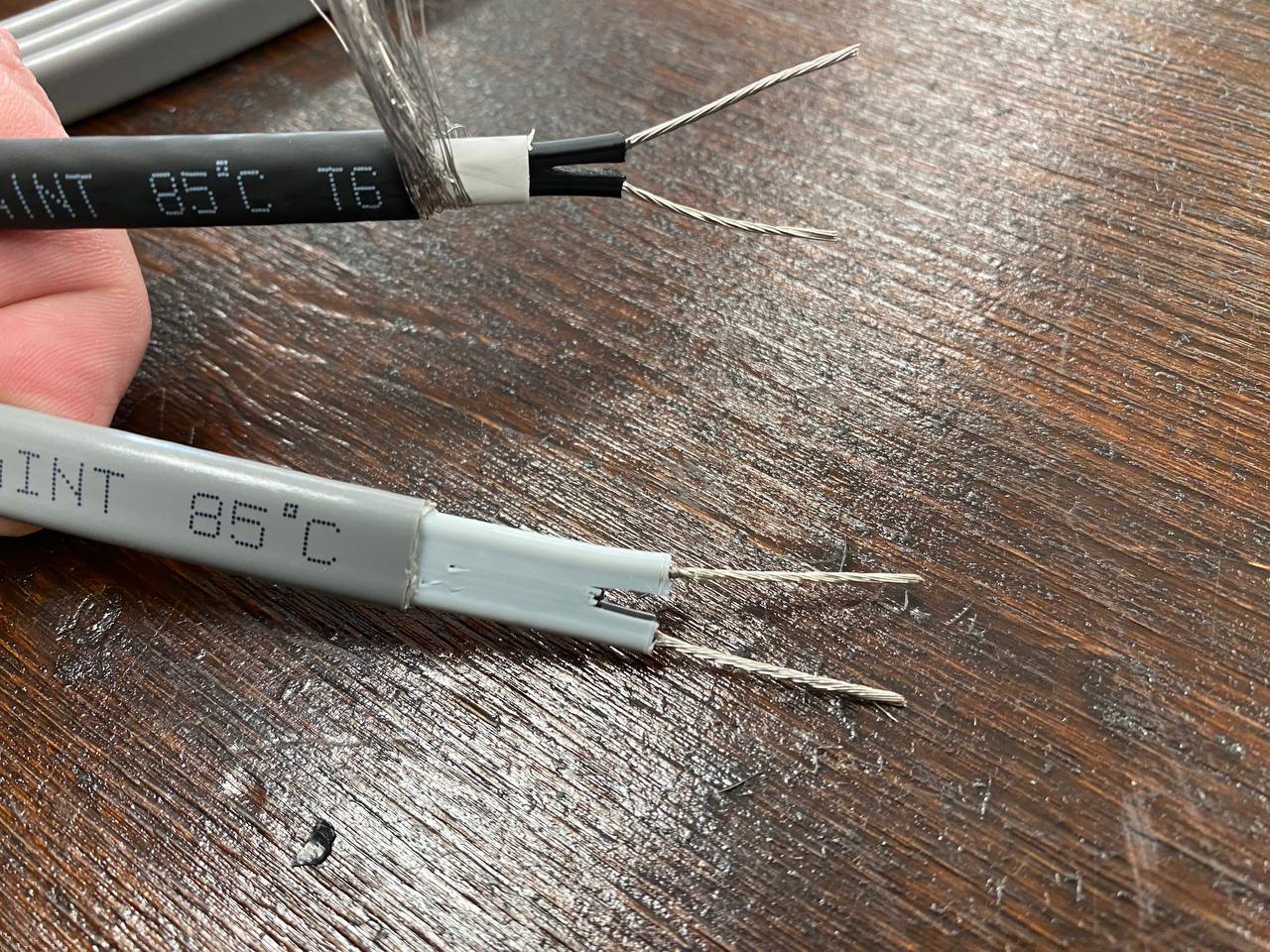 Имеем: два саморегулирующихся кабеля серого и черного цвета. Серый плоский мощностью 30Вт/м. Черный более округлый 16Вт/м. (цвет кабеля необязательно может совпадать с назначением)