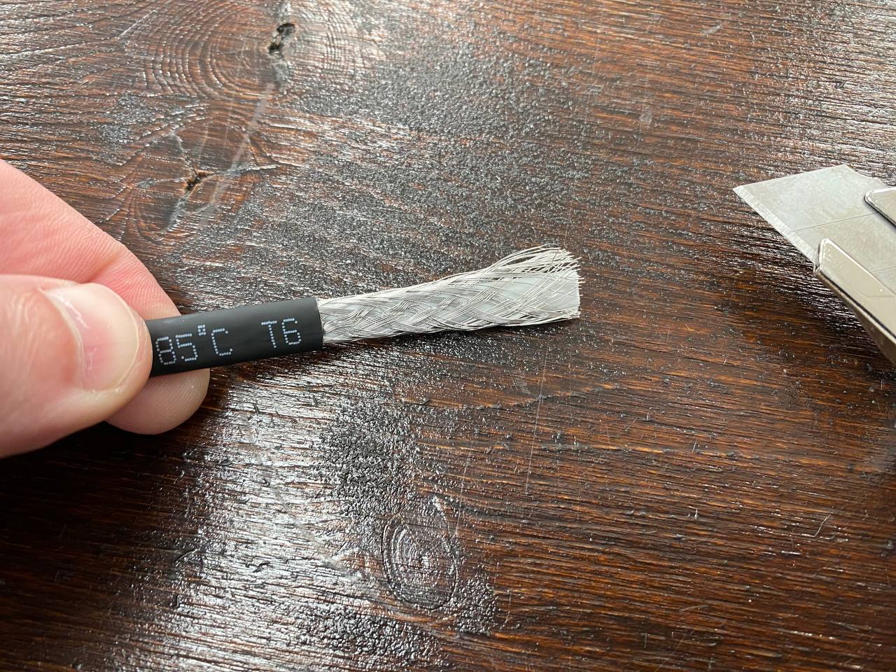 - Теперь мы должны зачистить токоведущие жилы от оплетки и нагревательной матрицы. Если произойдет повреждение провода, просто укоротите его и начните все с начала. Токоведущей жилы нам достаточно 5мм. Делаем небольшой запас на всякий случай.