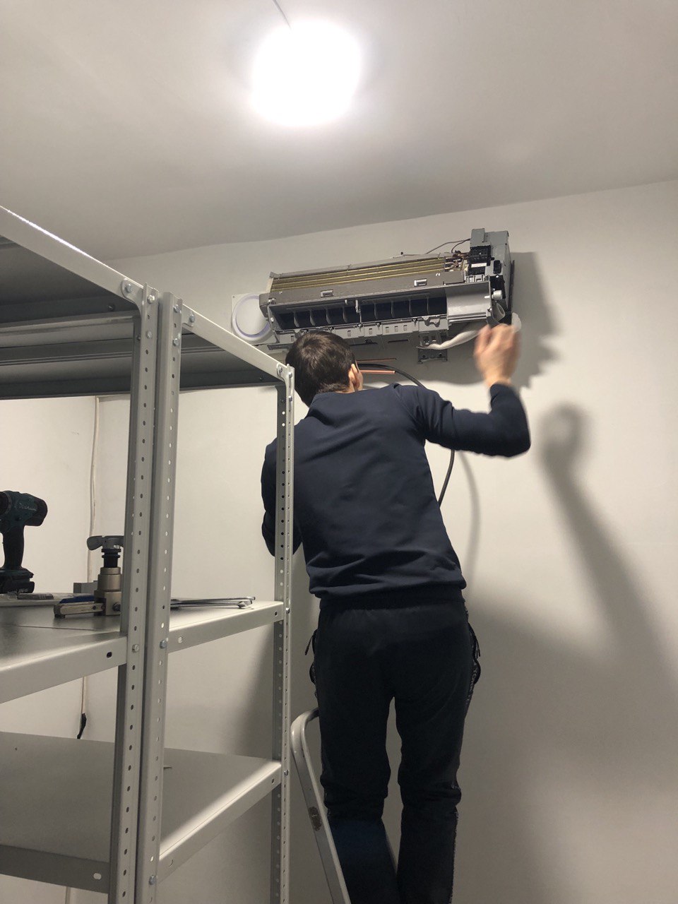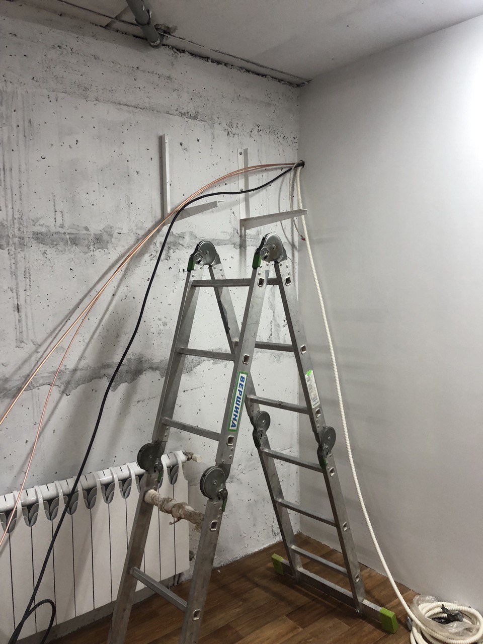 После укладки основной трассы, сразу крепим кронштейны для внешнего блока и приступаем к установке самого холодильного оборудования.
