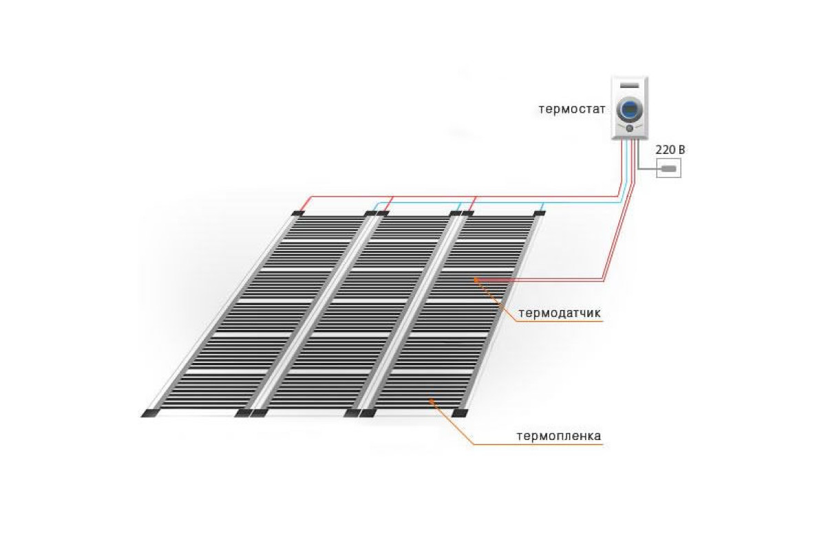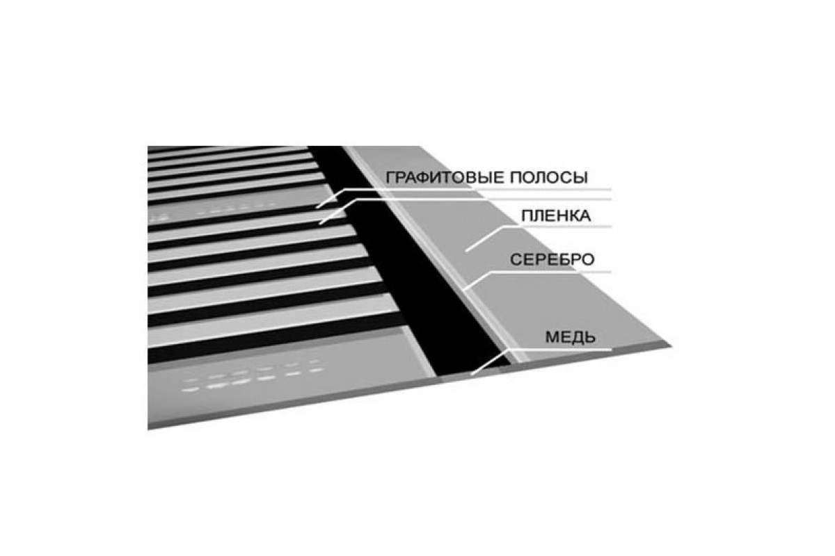 Термическая пленка, представляет собой совокупность греющих карбоновых полос, соединенных между собой. Слой ламинации из высокопрочного полимера защищает от проникновения влаги, вншних повреждений, а также возможного возгорания, но в то же время пропускает инфракрасное излучение.