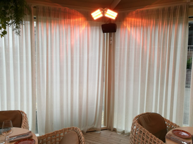 Наступили холода, и, довольно часто, к нам обращаются с вопросом отопления открытых площадей, террас, мероприятий на улице. В этот раз подвернулась отличная возможность не только обьяснить и рассказать о том- как замечательно греют инфракрасные обогреватели интенсивного типа, но и показать. Ресторация «Голый повар» нам любезно в этом помогла. А мы, в свою очередь, решили вопрос с локальным обогревом гостей их полуоткрытой террасы, буквально за один вечер. Полностью, «под ключ». Примечательно в данной системе то- что нет необходимости отапливать всю площадь террасы целиком. Зоны включаются в зависимости от посадки гостей, что позволяет существенно снизить энергопотребление в целом.