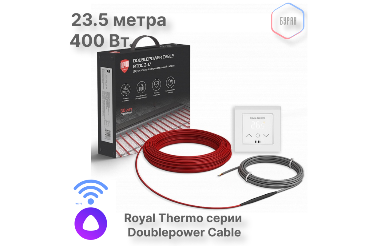 Кабель нагревательный Royal Thermo RTDC 2-17-400 с терморегулятором RTS-16 – это удобство, надёжность и комфорт в одном решении. С ним вы получите быстрый монтаж, экономию энергии и долговечную систему обогрева.