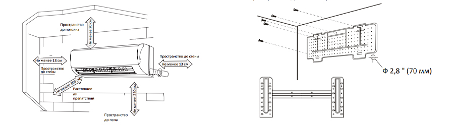 - Выбор места установки внутреннего блока. Важно убедиться, что струя холодного воздуха не направлена на места отдыха, растения и места для животных. Необходимо также соблюдать нормативы по расстоянию от потолка и преград.