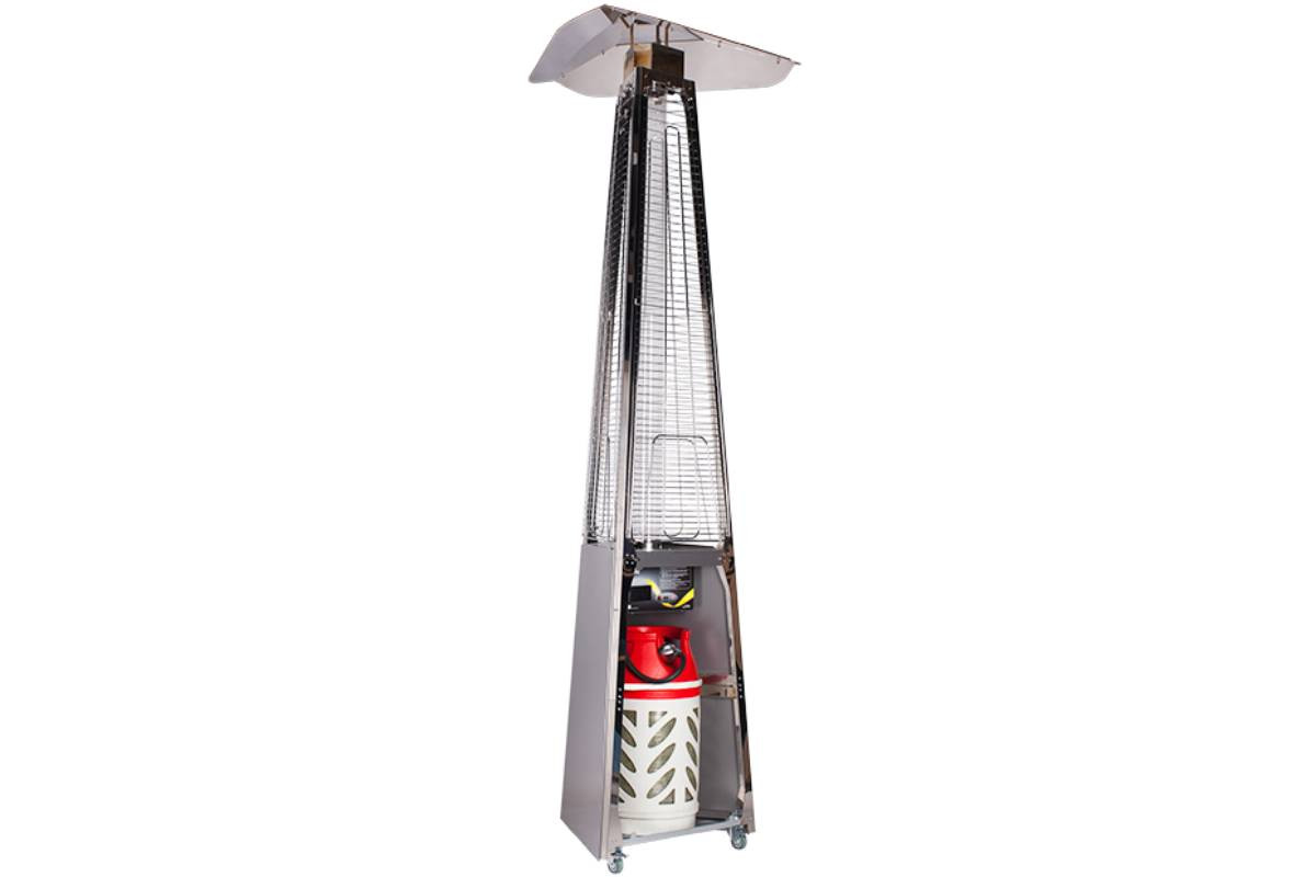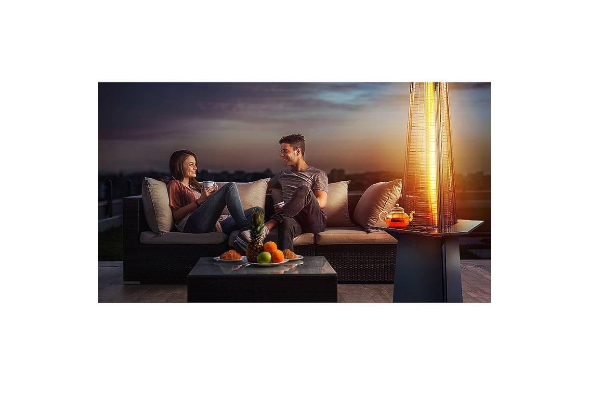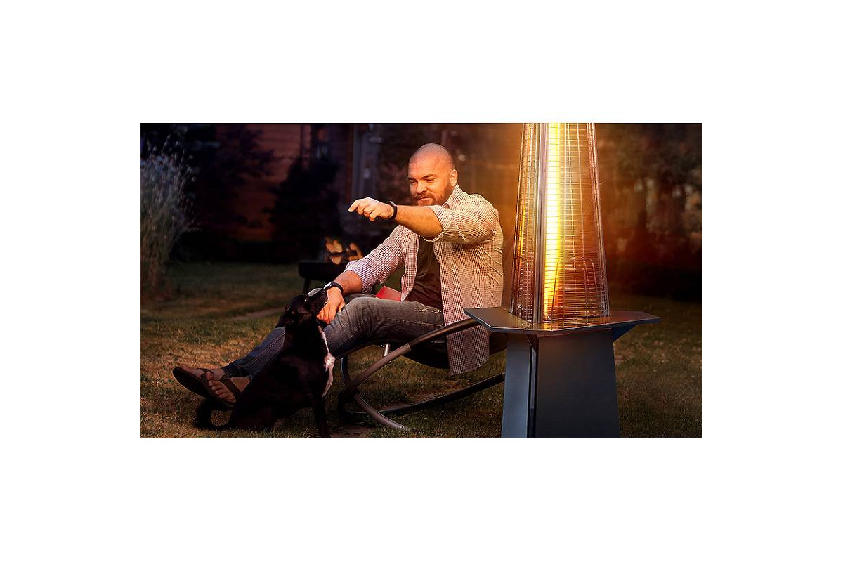 Уличный камин изготовлен из устойчивой к коррозии легированной нержавеющей стали и защищен от попадания атмосферных осадков сверху четырехгранным отражателем, площадь поверхности которого составляет 0,5 м². За безопасность эксплуатации отвечает многоуровневая система защиты. Датчик наклона отключает пламя при наклоне газового обогревателя более чем на 45°, термоэлектрический датчик и электромагнитный клапан сразу же останавливают подачу газа в критических ситуациях, таких как затухание пламени или утечка газа. За счёт встроенной колёсной базы обогреватель свободно и безопасно можно перемещать по любой поверхности.