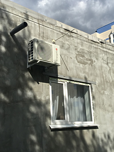 Внутренний блок установили под потолком. Строение потолка в зале не позволили его «спрятать», но это не испортило интерьер. На фото все хорошо видно.