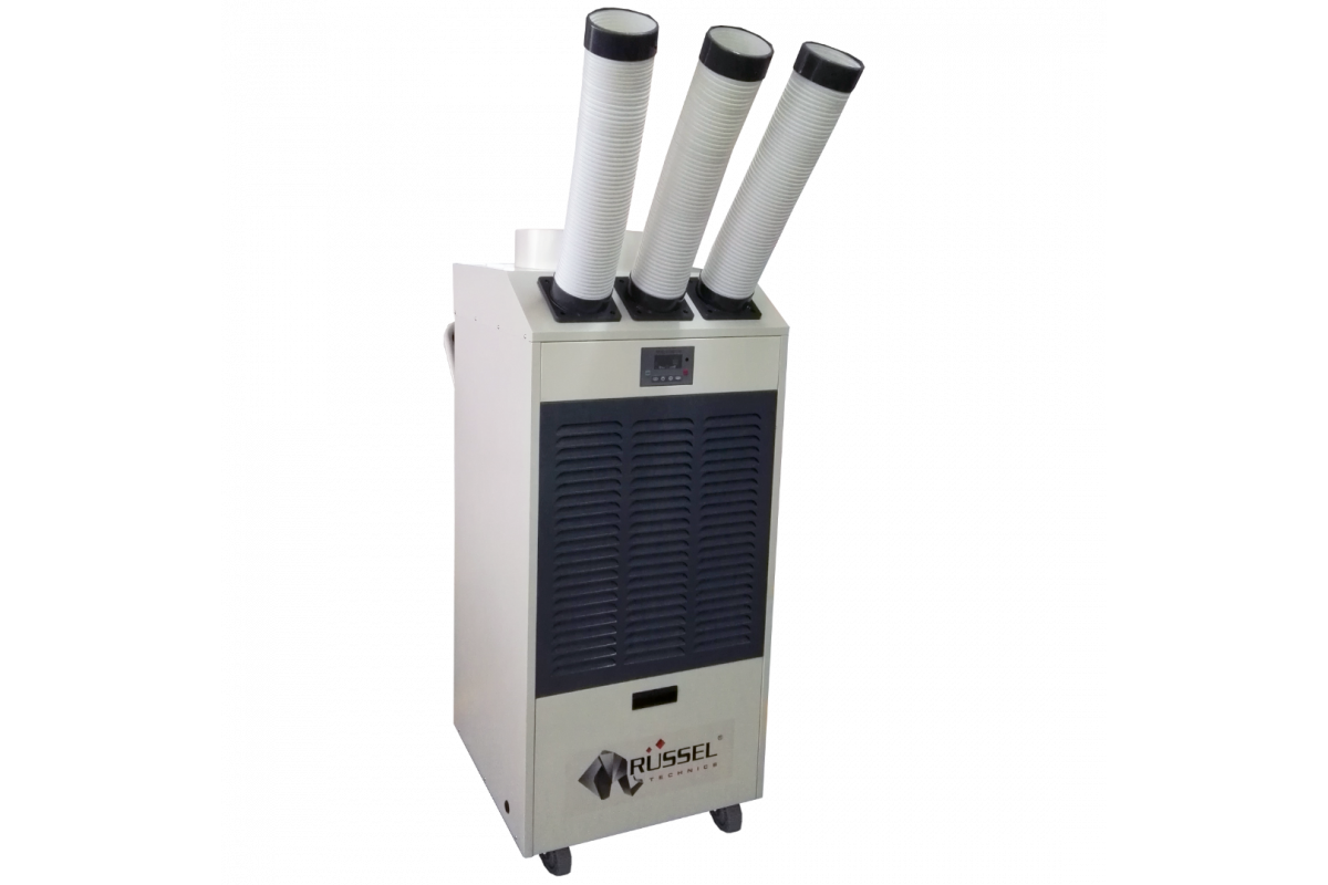 Мобильный промышленный кондиционер RŬSSEL Technics RPAC-35H представляет собой единый корпус, установленный на колеса для передвижения. Основными частями кондиционера являются: испаритель (расположен на передней панели, закрытый фильтром и защитной решеткой), конденсатор (расположен сзади кондиционера и закрыт решеткой), компрессор, вентиляторы конденсатора и испарителя, панель управления (расположена на передней панели кондиционера), ручка для передвижения, воздухораздающий патрубок, защитная решетка вентилятора конденсатора, сетевой шнур. Оборудование полностью заправлено хладагентом и готово к работе. Детальное описание кондиционера, инструкция по эксплуатации, обслуживанию и ремонту представлены в разделе Тех. Информация.