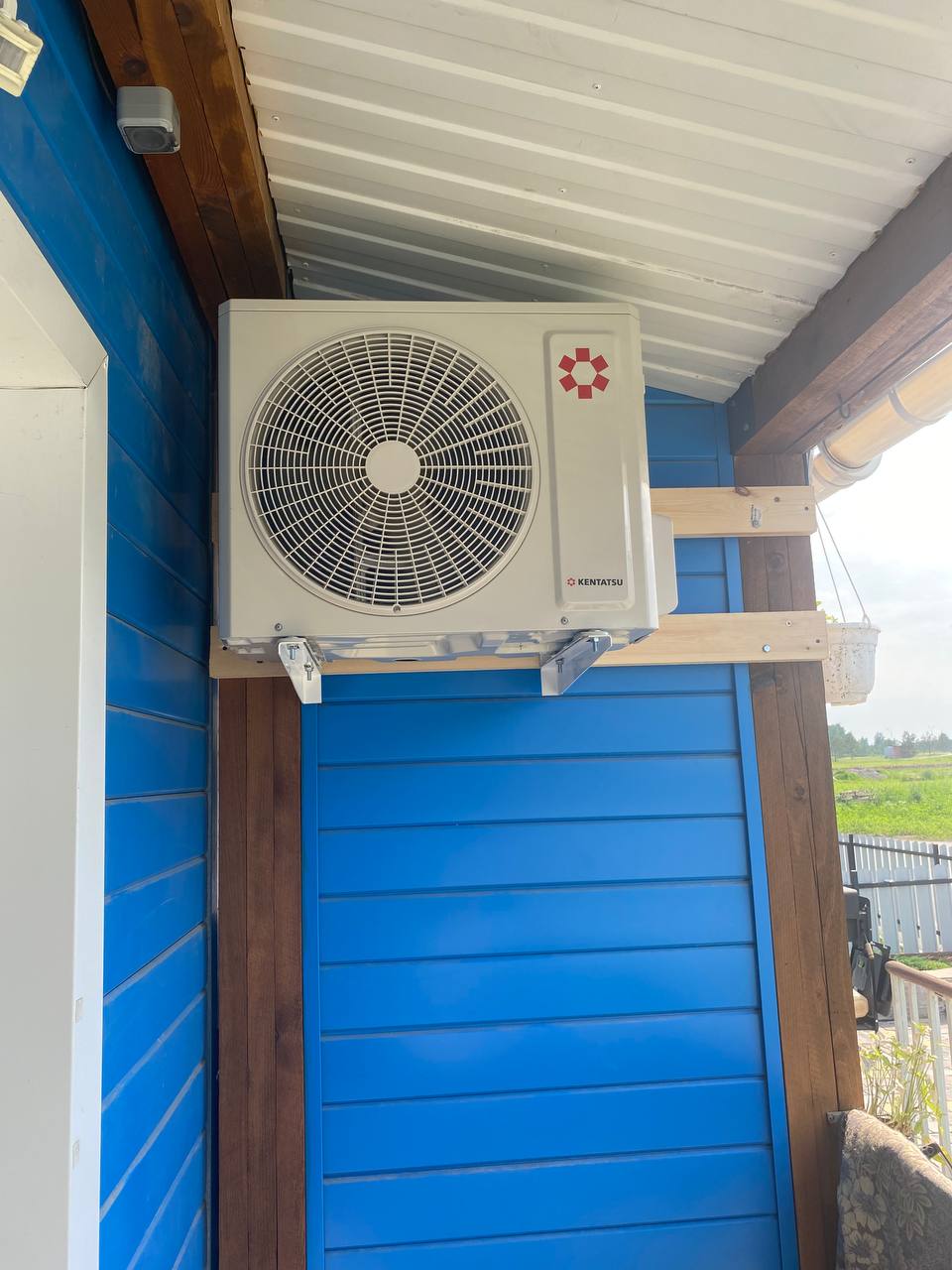 Внешний блок кондиционера Kentatsu Thibo 35 был установлен на внешней стене второго этажа. Для этого потребовалось укрепить крепления и обеспечить надежное крепление блока, учитывая вес и возможные вибрации. Особое внимание уделили защите от атмосферных воздействий и безопасности монтажа.