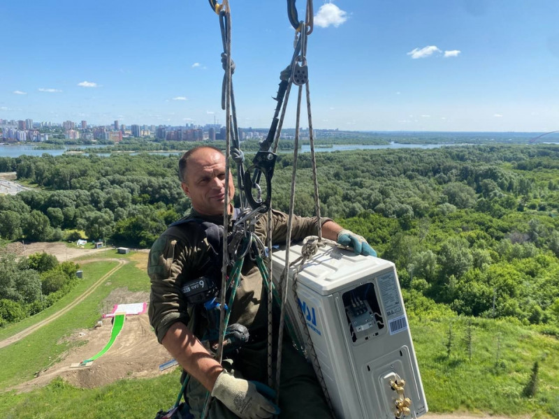 Для выполнения наружных работ на высоте мы вновь обратились к нашему надёжному партнёру — промышленному альпинисту Михаилу, с которым нас связывает более 100 успешно реализованных проектов по всему Новосибирску. Его участие обеспечивает не только безопасность, но и высокое качество исполнения даже в самых сложных условиях.