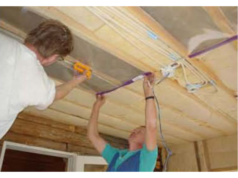монтаж ик обогревателей, монтаж инфракрасных обогревателейМонтаж пленочного инфракрасного потолочного обогрева начинается с укрепления теплоотражающего материала на поверхности потолка (например, полифом, экофол, пенотерм). Теплоотражающий материал должен быть на лавсановой основе ( не проводить электрический ток ) и закрывать 100% потолочной поверхности. Рекомендуется материал располагать таким образом, чтобы края немного заходили на стены, для того чтобы исключить теплопотери с углов помещения. Через материал сверлется отверстие и вставляется крепеж, материал выравнивается и делается следующее отверстие, шаг крепежа 0,5 м. Главная задача не допустить больших провисов.