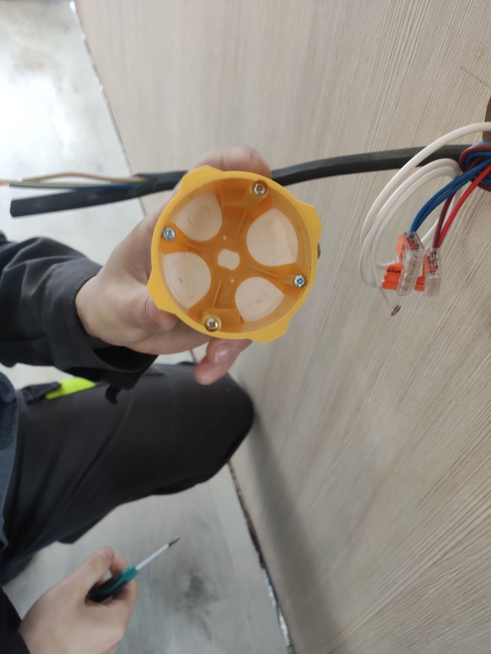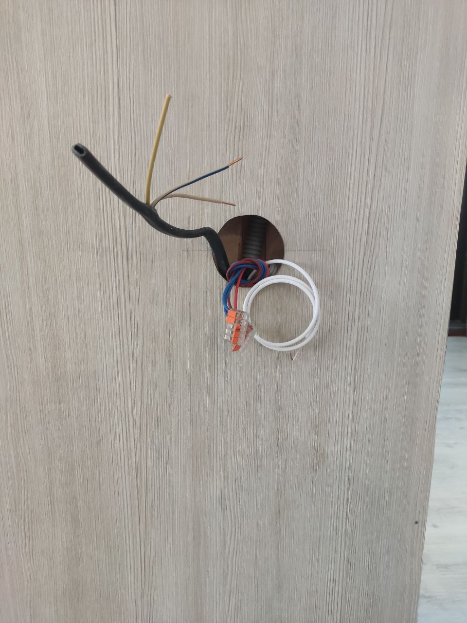 На фото показаны все этапы монтажа встроенного терморегулятора (Установка специального герметичного стакана, подключение проводов и датчика)