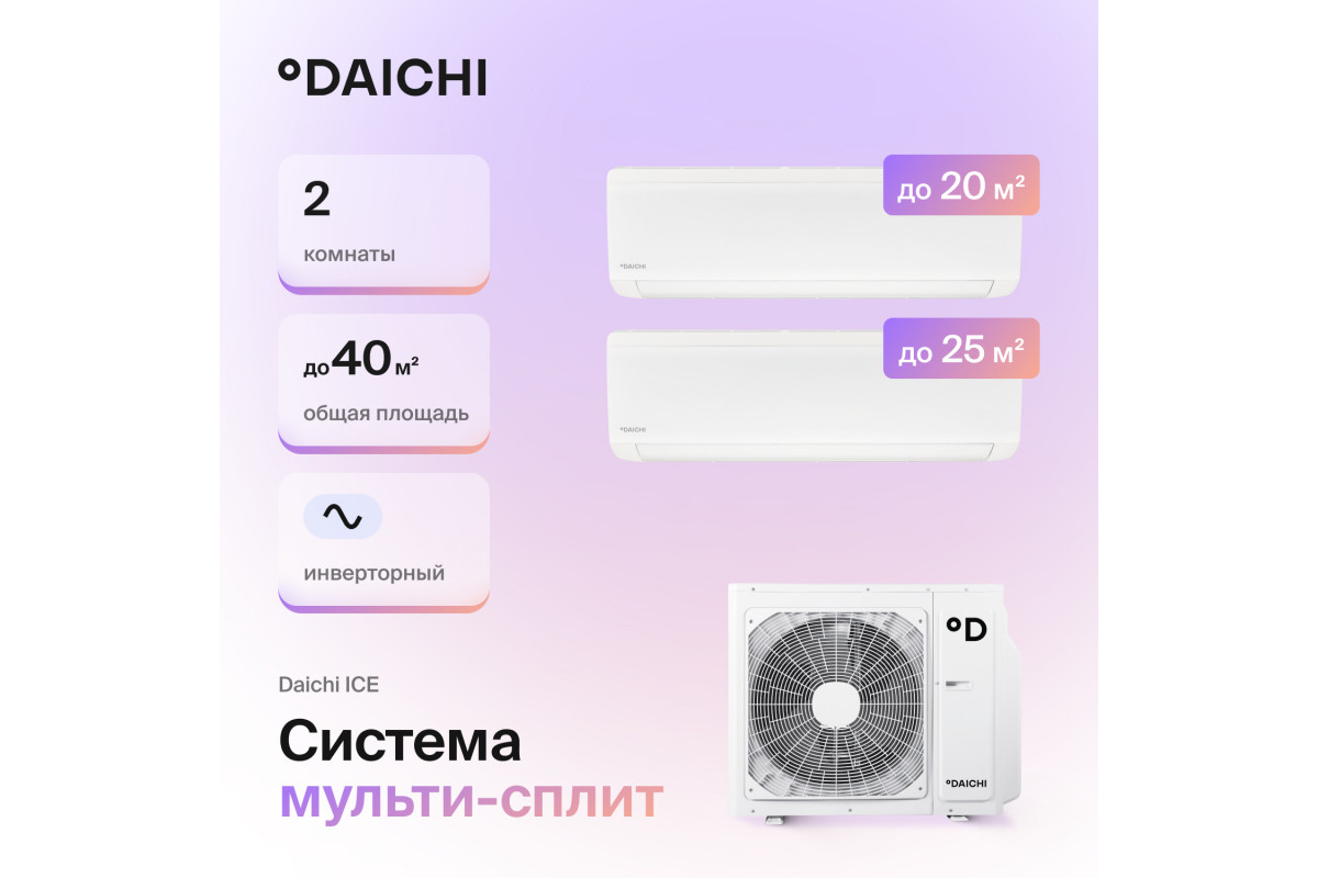 Мультисплит-система Daichi ICE Inverter — отличное решение для создания комфортного микроклимата в двух комнатах разной площади. Инверторная технология, широкий выбор режимов работы и низкий уровень шума делают эту модель универсальной и удобной в эксплуатации. Выберите комфорт с мультисплит-системой Daichi!
