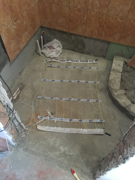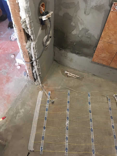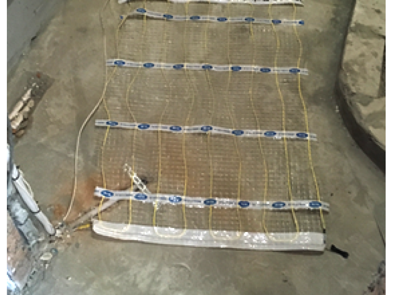 Монтажники, приехав на объект, оперативно уложили греющий мат и термодатчик, врезали распредкоробку для терморегулятора в кирпичную стену, подключили систему к электричеству. По просьбе строителей фиксирование греющего мата к полу не проводилась.