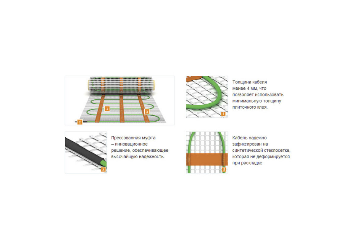 Мат оснащён двухжильным экранированным кабелем, закреплённым на стекловолоконной сетке с постоянным шагом укладки 10 см, что обеспечивает равномерный нагрев и упрощает установку. Благодаря тонкой конструкции, мат можно укладывать непосредственно в плиточный клей, без необходимости дополнительной стяжки.​