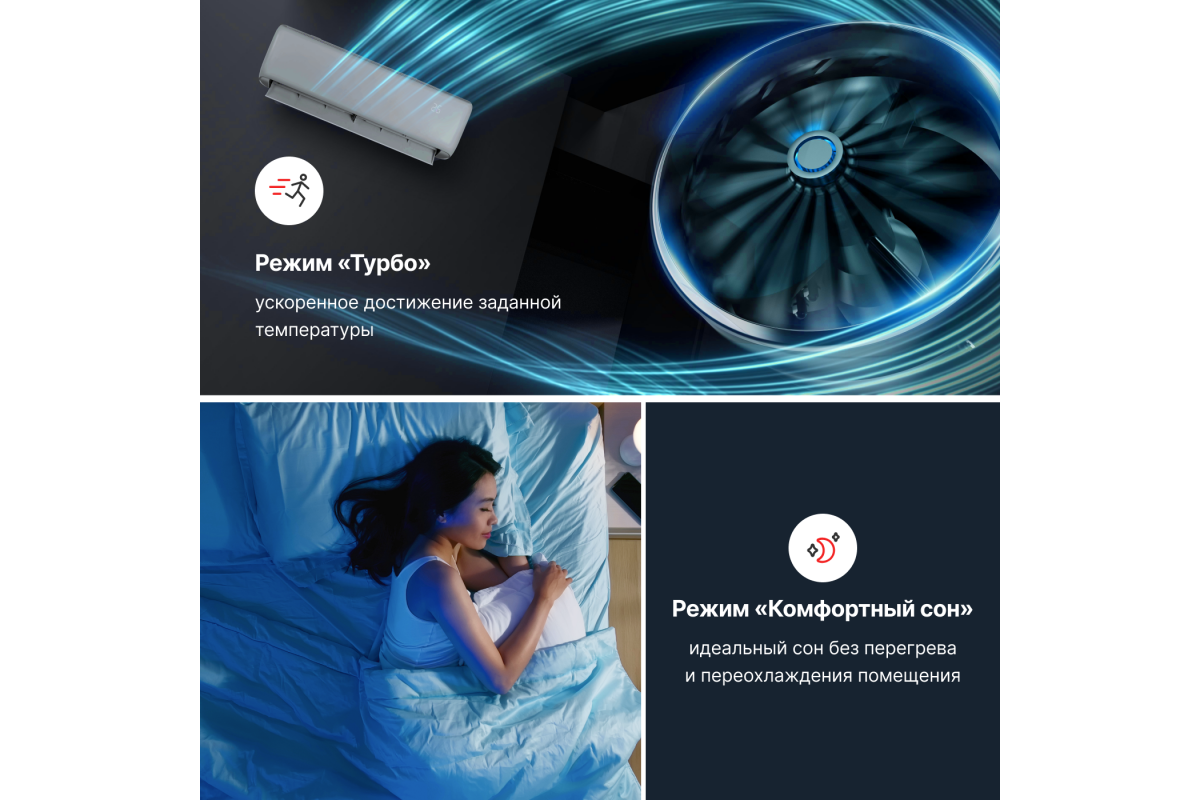 Режим "Комфортный сон": автоматически регулирует температуру в ночное время для максимального удобства.