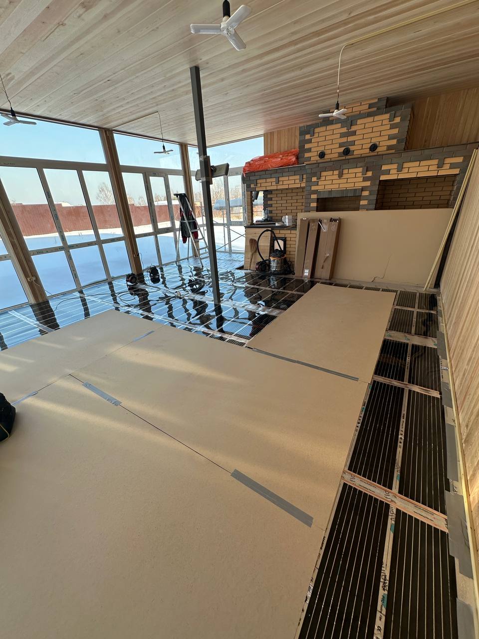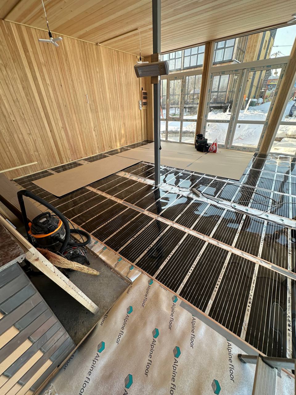 В качестве финального покрытия на объекте был выбран кварц-винил – долговечный и устойчивый к износу материал, который сохраняет теплоизоляционные свойства. Для максимальной эффективности уложена специальная тонкая подложка, улучшающая теплораспределение.