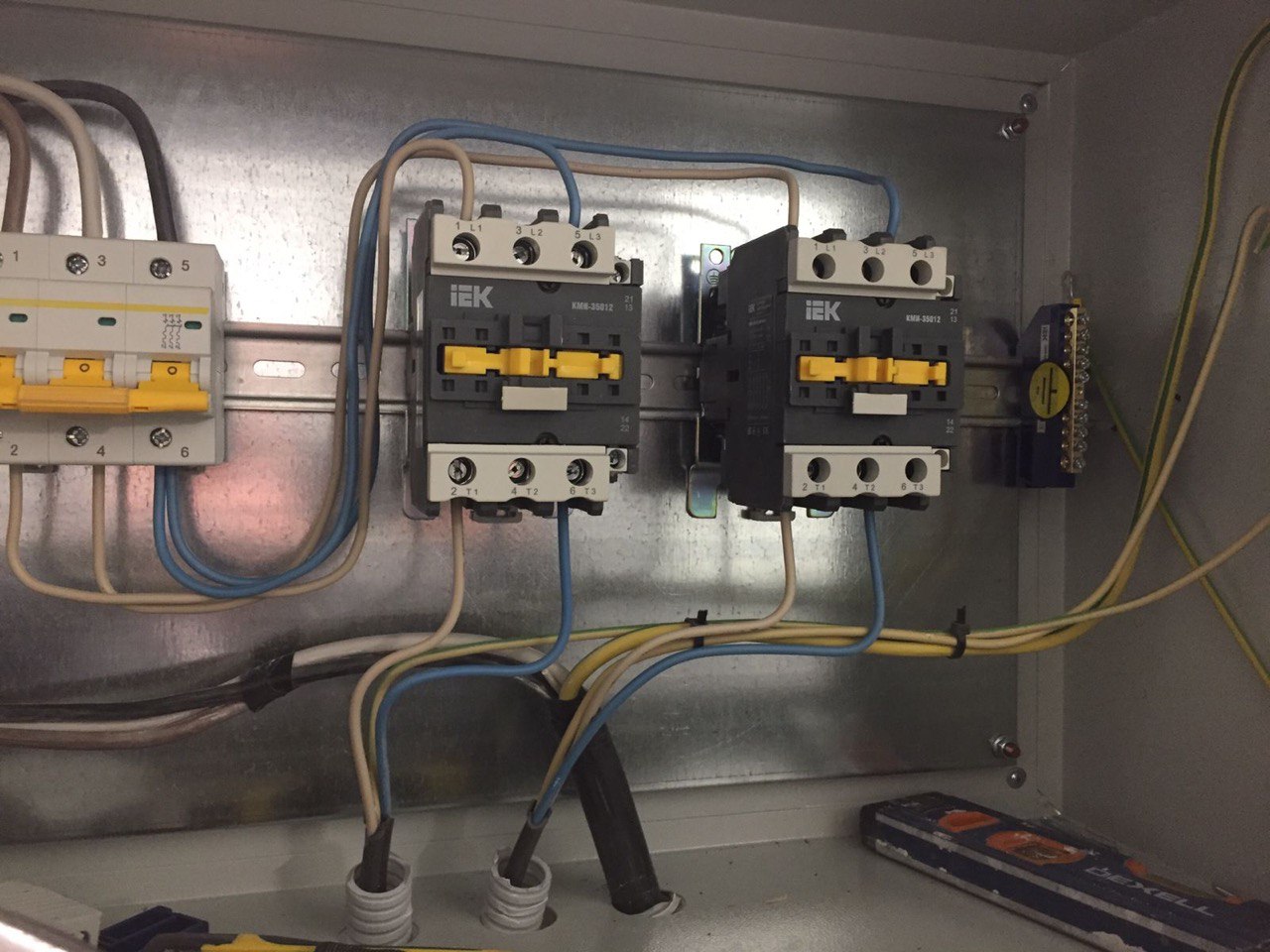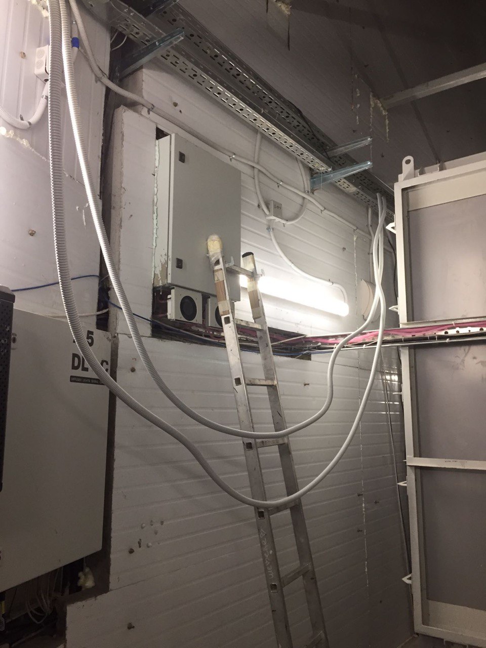 Так как потолки достаточно высоки порядка 8-9 м. был выбран вариант потолочных обогревателей ик 2.8 кВт с температурой нагрева до 300 градусов. В этих обогревателях излучение идет с алюминиевой пластины разогреваемой трубчатым тэном. Наши электрики начали монтаж шкафа управления и прокладку питание. Как видно на фото подключение выполнено с соблюдением всех норм пожарной безопасности.
