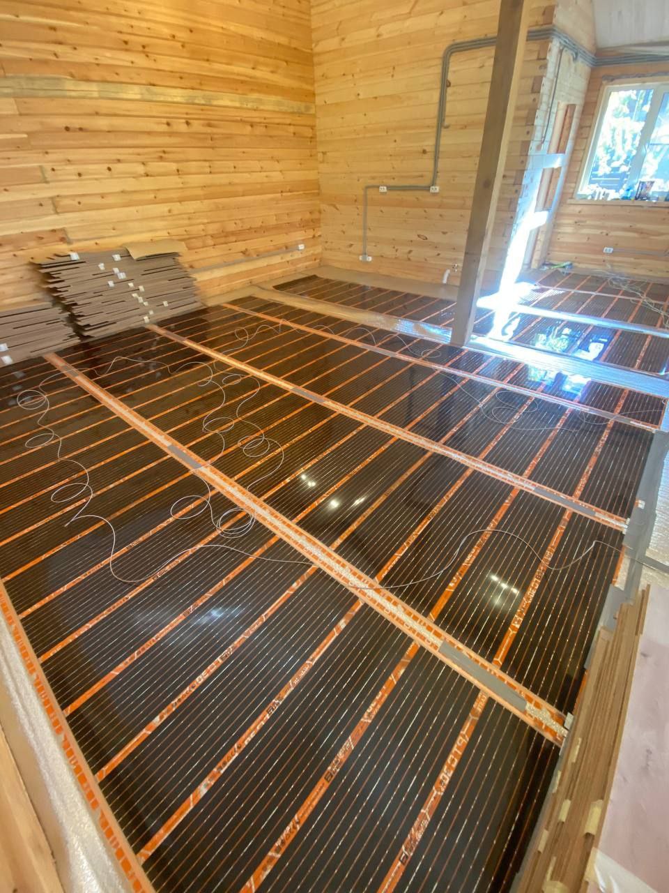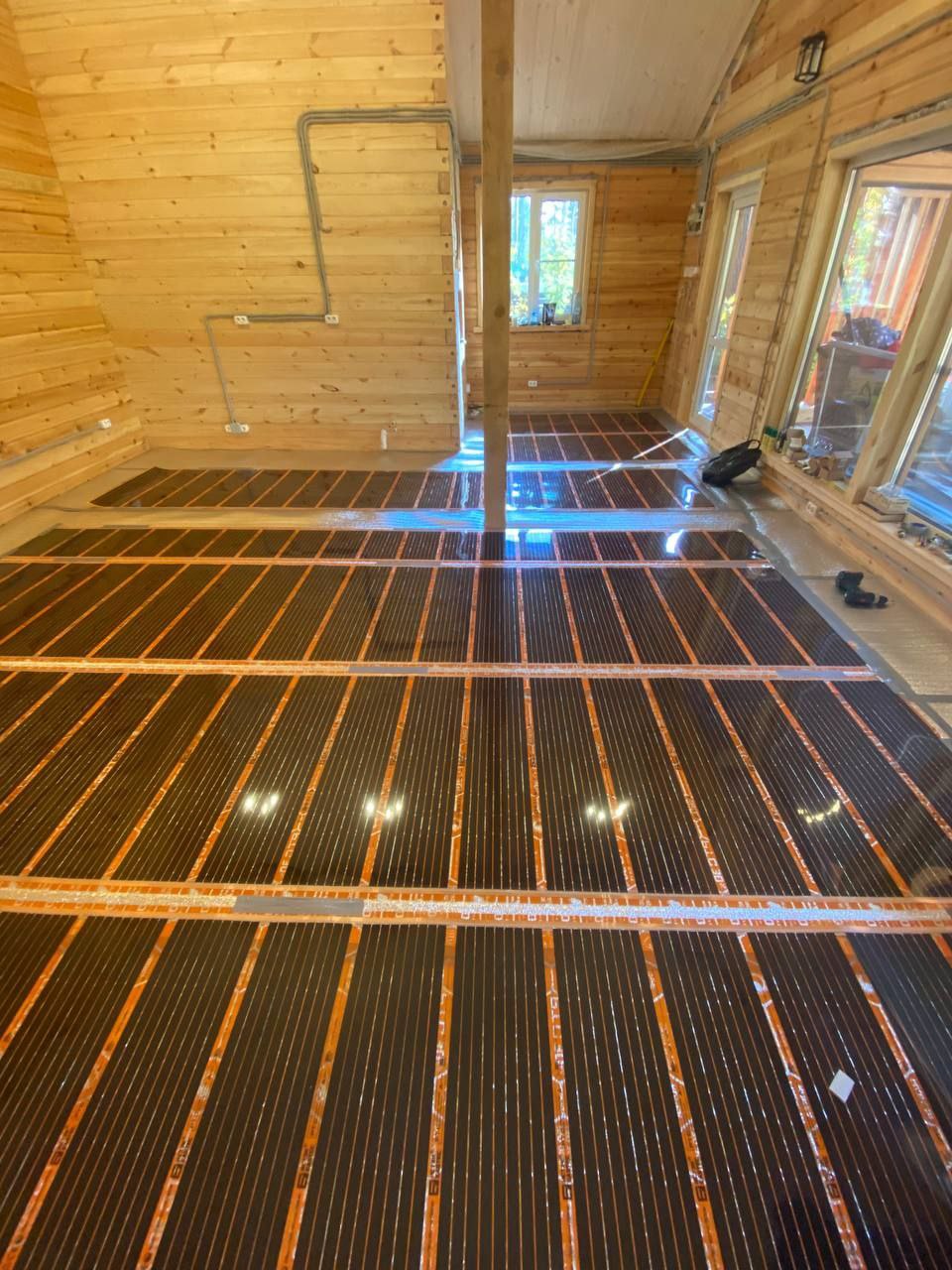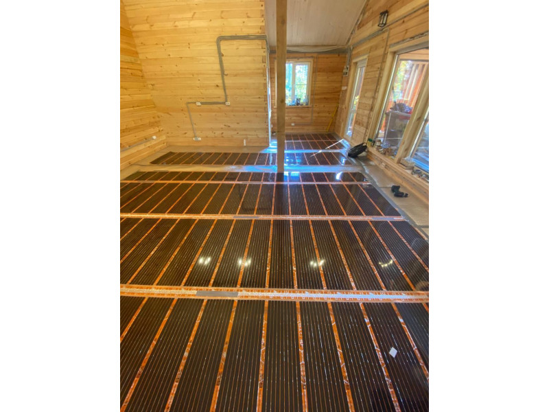 Сначала мы хотели исполнить это пожелание инфракрасными потолочными обогревателями Пион Thermo Glass Crystal, но выехав на замер с инженером пришли к выводу что энергоэффективнее будет сделать тёплый пол, покрыв как можно большую площадь помещения и использовать его как основной источник обогрева. Для этой задачи использовали плёночный тёплый пол Energy Save PTC Orange, с эффектом саморегуляции, суть его заключается в том, что он снижает энергопотребление и соответственно теплоотдачу на 30% в местах где может произойти тепловое запирание. В санузле использовали Ультратонкий фольгированный тёплый пол Grandex MF, он используется специально для влажных помещений и имеет заземление, что очень важно при исполнении этой задачи.