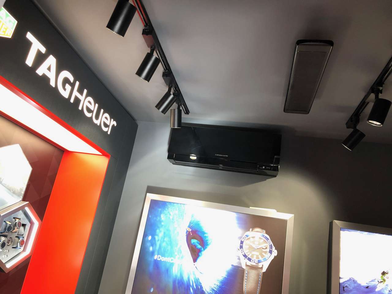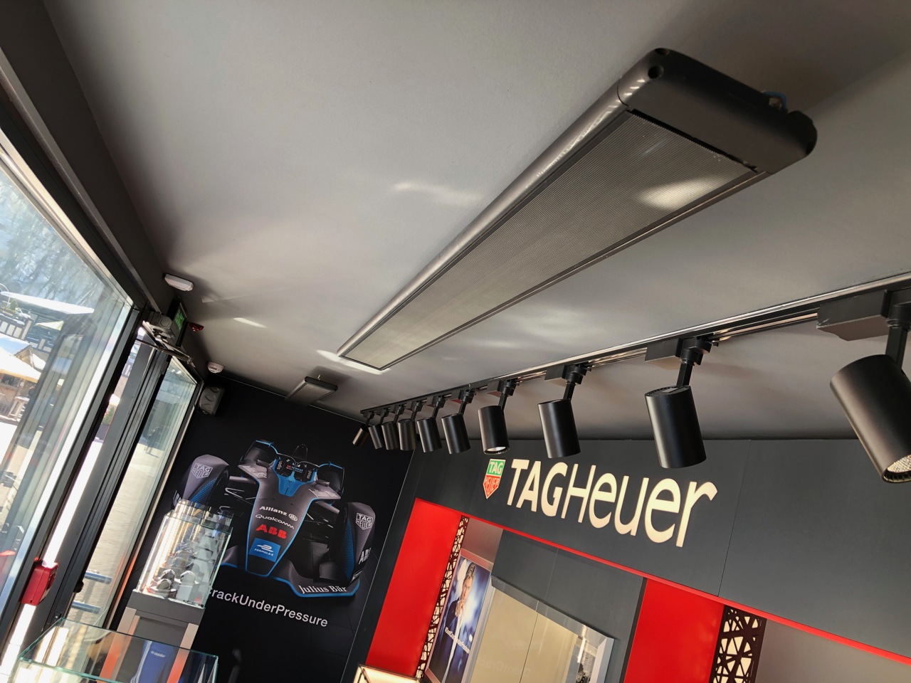 При этом, внутри он ничем не отличаются от элитного бутика. Добиться этого удалось за счёт грамотной работы дизайнеров и инженеров, реализовавших этот проект. Отопление и кондиционирование реализовано на базе инфракрасных обогревателей Алмак и дизайнерской сплит- системы Mitsubishi. Все сделали грамотно: обогреватель- греет, сплит- охлаждает (к теме отопления сплит- системами мы уже подходили неоднократно, нет смысла повторяться) Поскольку инфракрасные обогреватели не выпускаются в чёрном цвете - они были перекрашены термостойкой эмалью, что сделало их практически незаметными на потолке. Сейчас этот необычный объект находится на центральной площади горнолыжного курорта РозаХутор, а летом продолжит своё путешествие на побережье Чёрного моря.