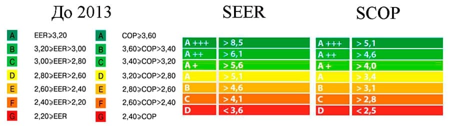 Вместо использования коэффициентов EER и COP, на новом значке производитель указывает сезонные значения энергоэффективности: SEER и SCOP. Это дает более точное представление о реальной работе климатического оборудования в течение года в условиях европейского климата.