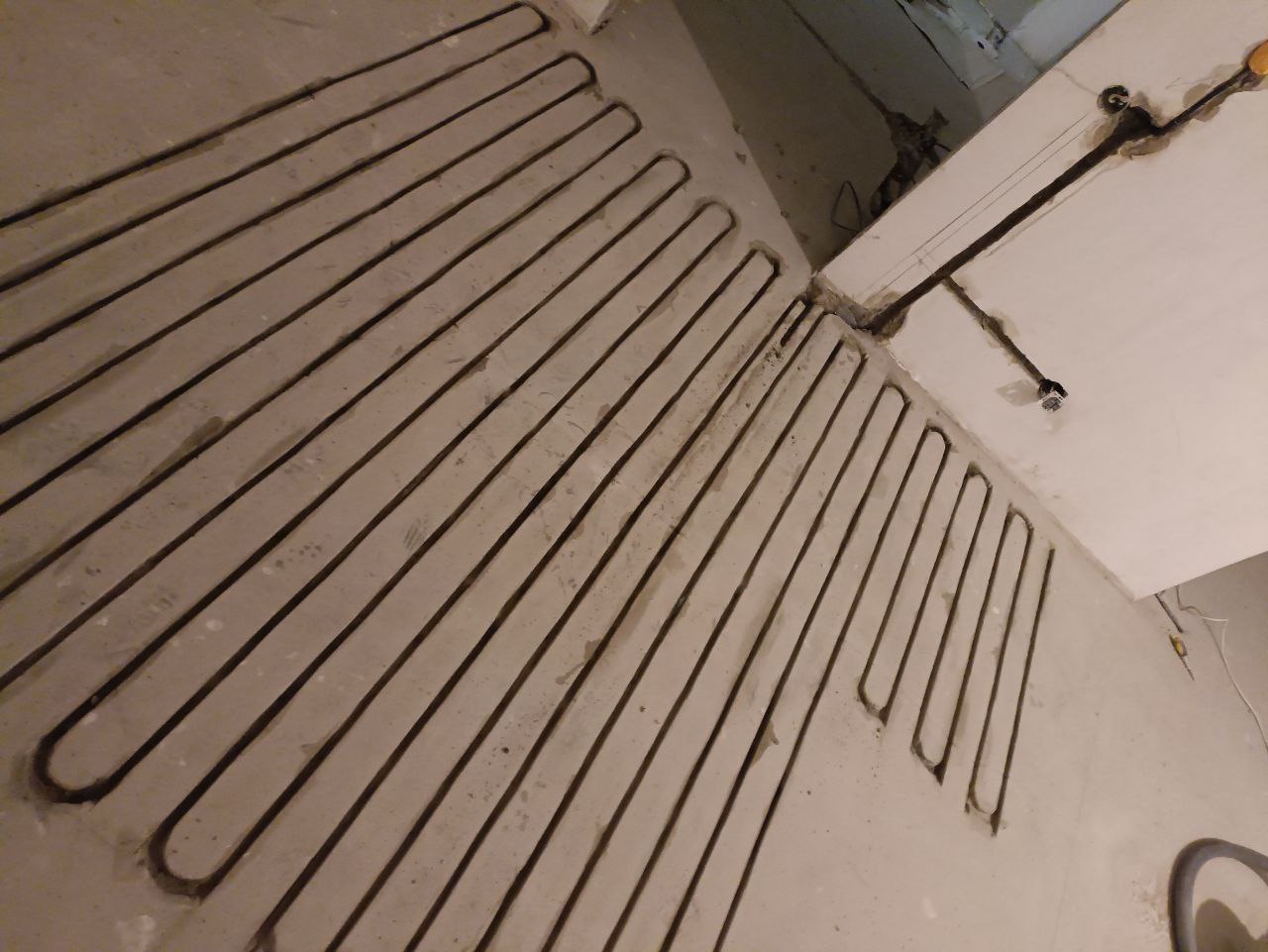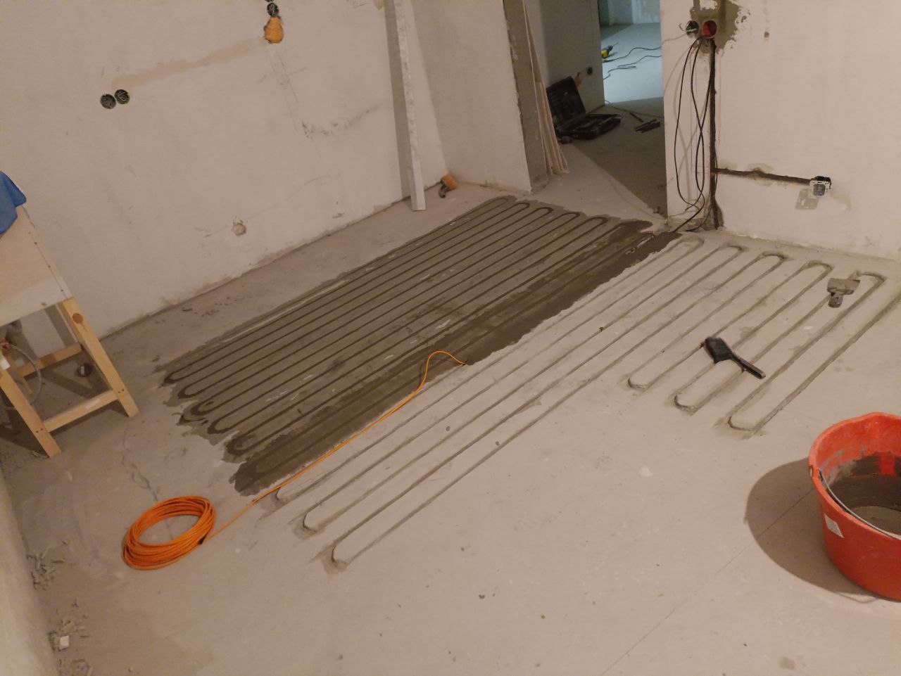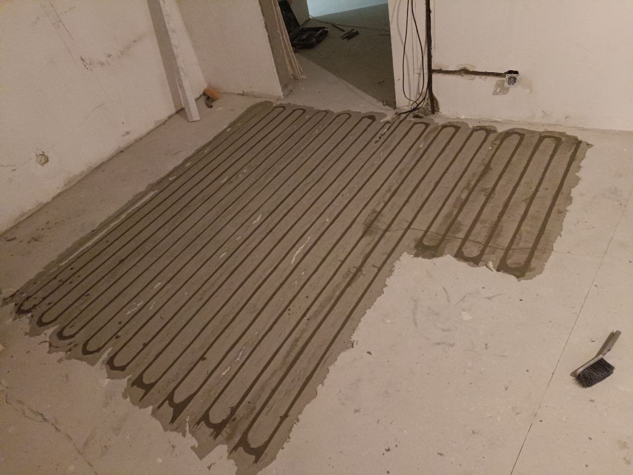 В ходе ремонта в новой квартире или при желании изменить уровень комфорта в старом жилище к лучшему, у владельцев жилья возникает желание обзавестись новым напольным покрытием, ну и конечно же, теплым полом. Однако, в ходе ремонта возникает много сложностей касаемо изменения уровня напольного покрытия и стыковки разных напольных покрытий, таких как керамогранит и ламинат. Также немалую роль играет качество стяжки, выполненной застройщиком. Так наш давний знакомый - Руслан решил обустроить комбинированное напольное покрытие, состыковав керамогранит с ламинатом, уже закупил материал и получилось, что в сочетании с разностью толщин материалов и "ровного глаза" застройщика, было возможно уложить теплый пол в слой плиточного клея, но при этом пришлось бы подливать около 2-х см стяжки по всей квартире, а её площадь составляет немного-немало, а 100 кв.м.! Таким образом, нами было предложено и реализовано следующее решение: была подобрана кабельная секция (длина которой составила 50 м), размечено положение штроб в уже готовой стяжке от застройщика, нарезаны штробы, в которые с применением строительной смеси и был уложен греющий кабель (что немало важно - не допуская "завоздушивания" кабеля!)