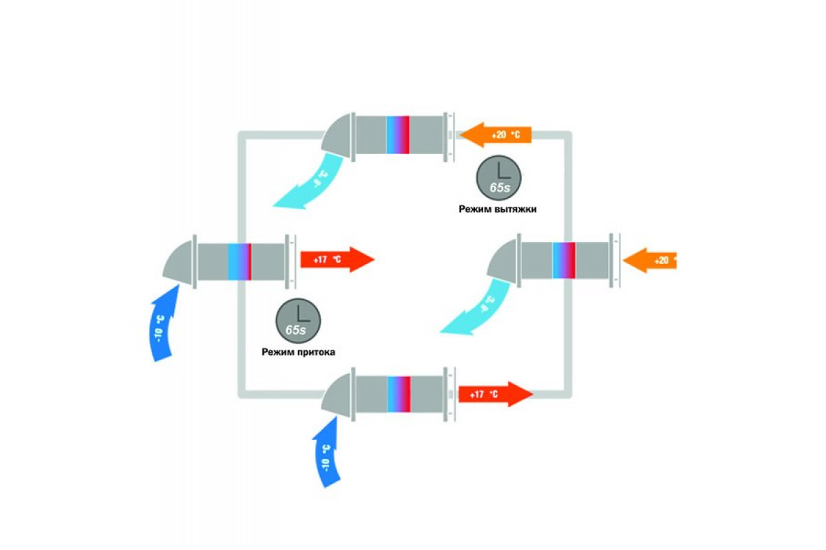 • Рекуперация — интеллектуальная смена режимов каждые ~65 сек: теплообменник нагревается теплым воздухом, затем отдает тепло приточному, сохраняя энергию.