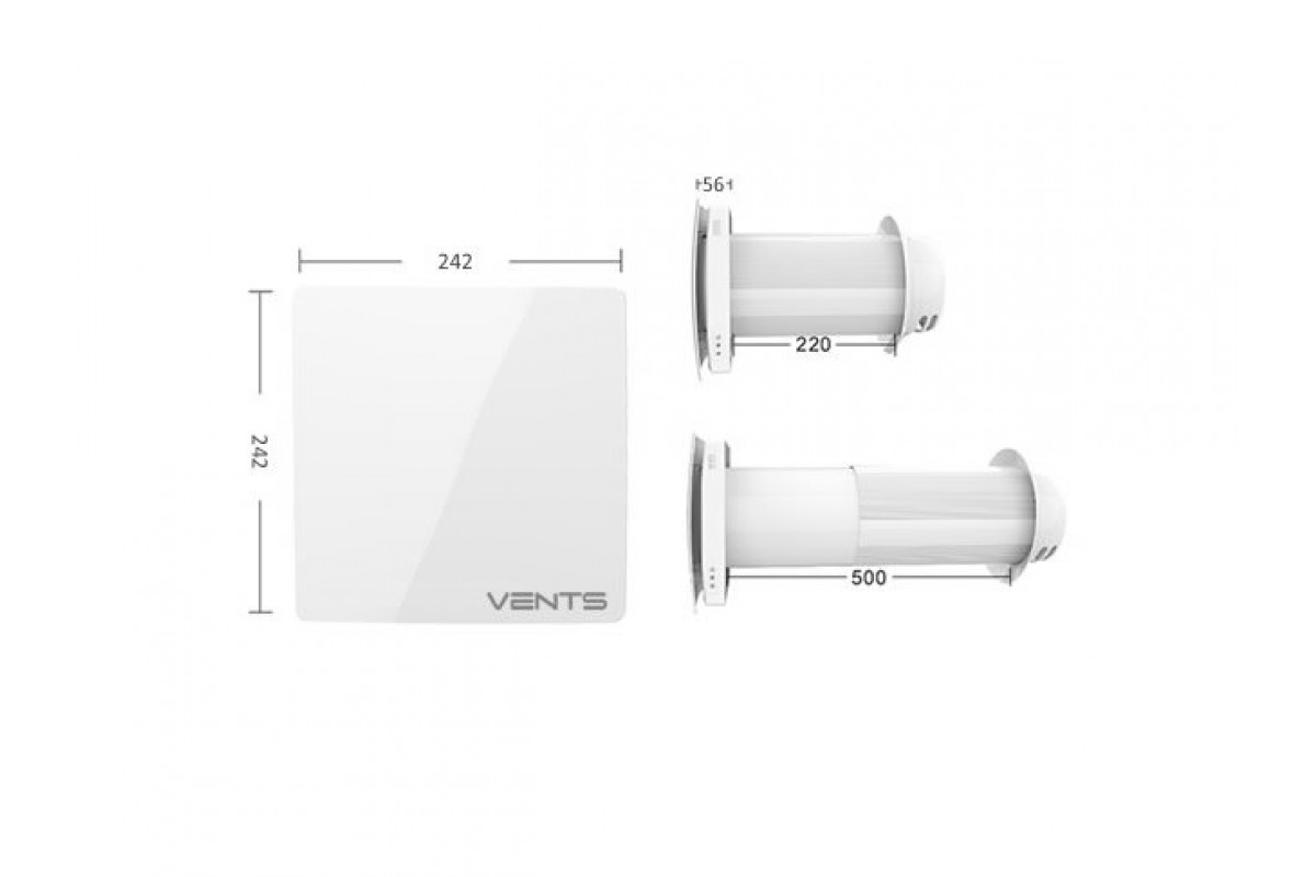 • Компактный дизайн: корпус 242×242×56 мм, воздуховод Ø 160 мм, стенка от 220 мм.