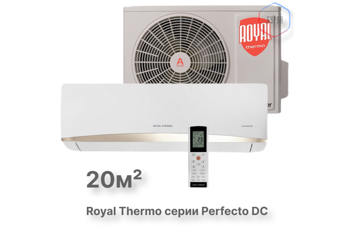 Сплит-система инверторного типа Royal Thermo Perfecto DC RTPI-07HN8 комплект идеально подходит для помещений площадью до 20 м², обеспечивая эффективное охлаждение и обогрев. Это отличный выбор для спальни, кабинета или небольшой гостиной. ​