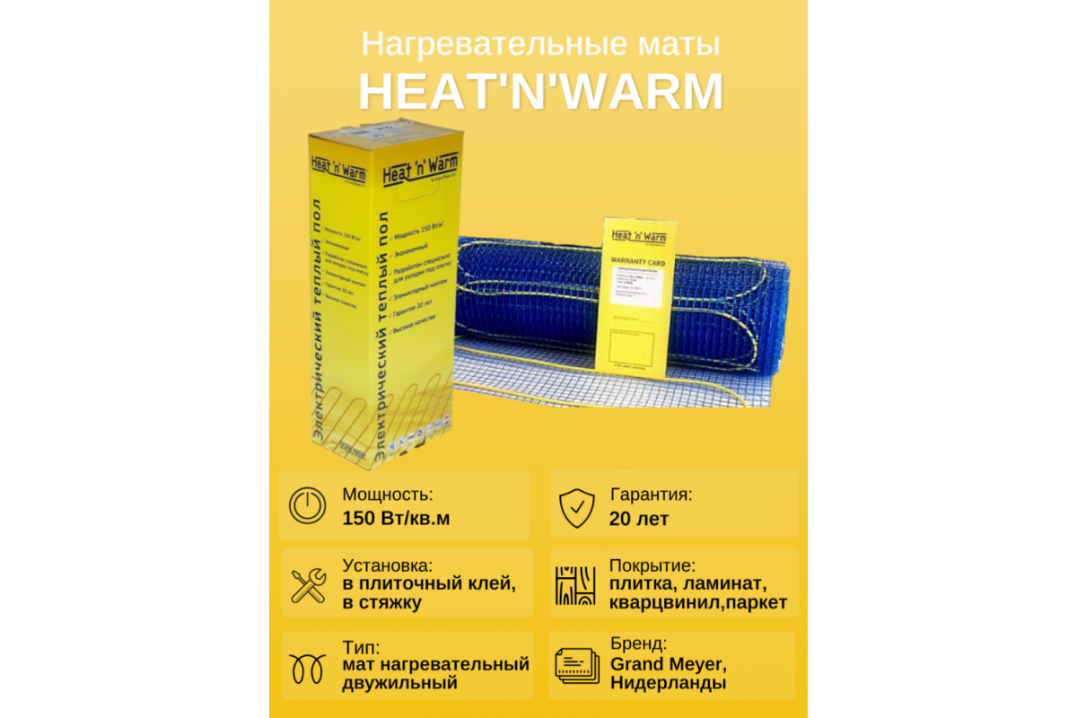 Представляем вашему вниманию Теплый пол нагревательный мат Heat'n'Warm EcoNG150-010 (1,0 кв. м) — эффективное и надежное решение для создания комфортного теплого пола в вашем доме. Этот электрический теплый пол обеспечивает равномерный обогрев поверхности и отличается простотой монтажа.