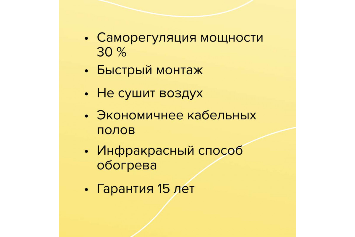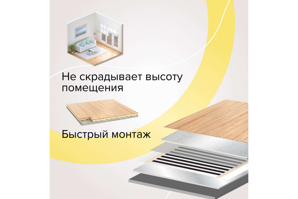 Инфракрасная технология обеспечивает равномерное распределение тепла по всей поверхности пола, создавая комфортные условия в помещении. Мощность 230 Вт/м² позволяет быстро прогревать помещение до необходимой температуры.​
