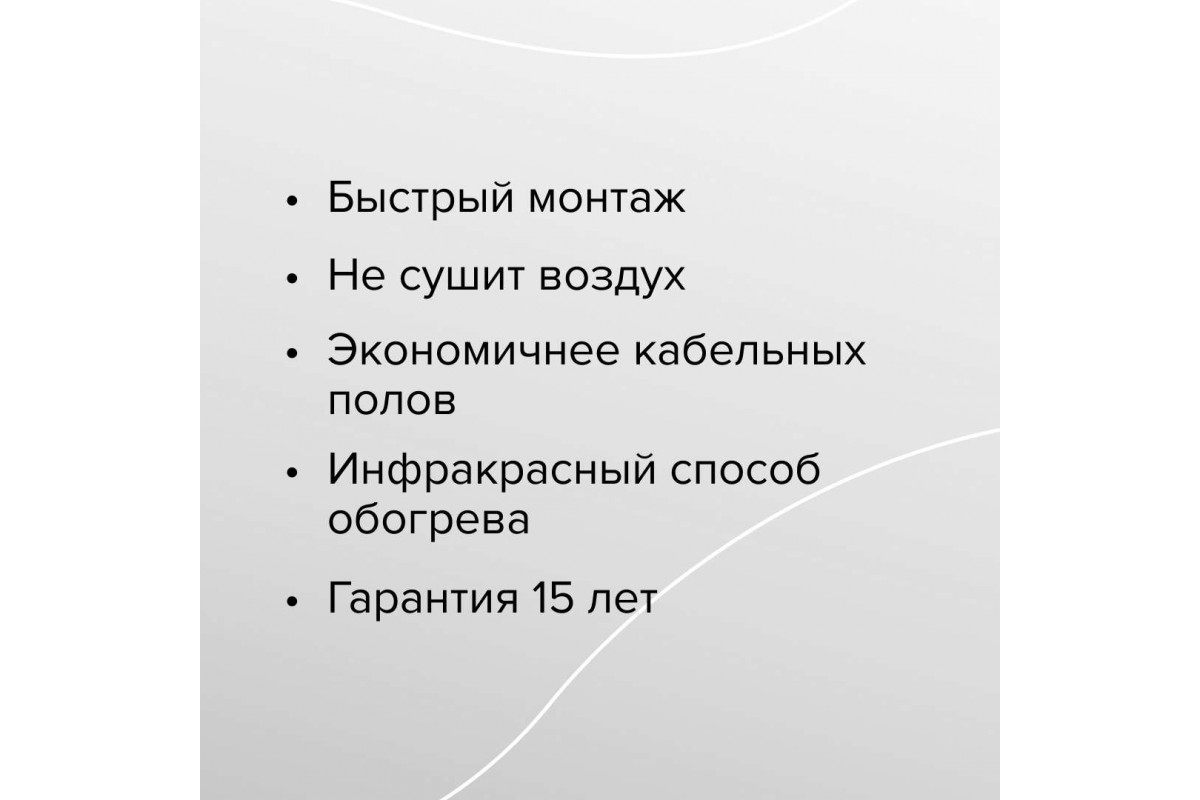 Система отличается низким энергопотреблением и высокой эффективностью, что позволяет снизить затраты на отопление. Инфракрасный обогрев не сушит воздух и не сжигает кислород, сохраняя естественный микроклимат в помещении.