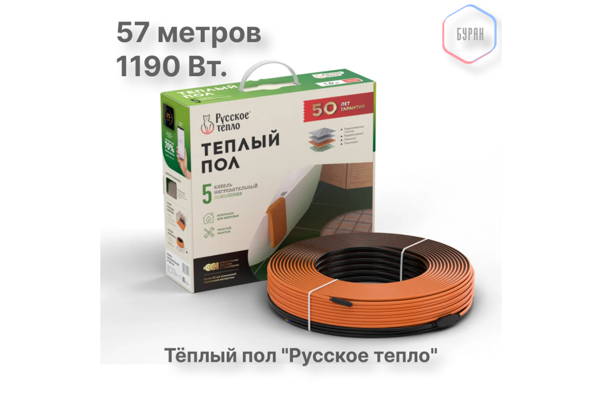 Теплый пол кабельный "Русское тепло" РТ-1190-57,0 — надёжный нагревательный мат под плитку