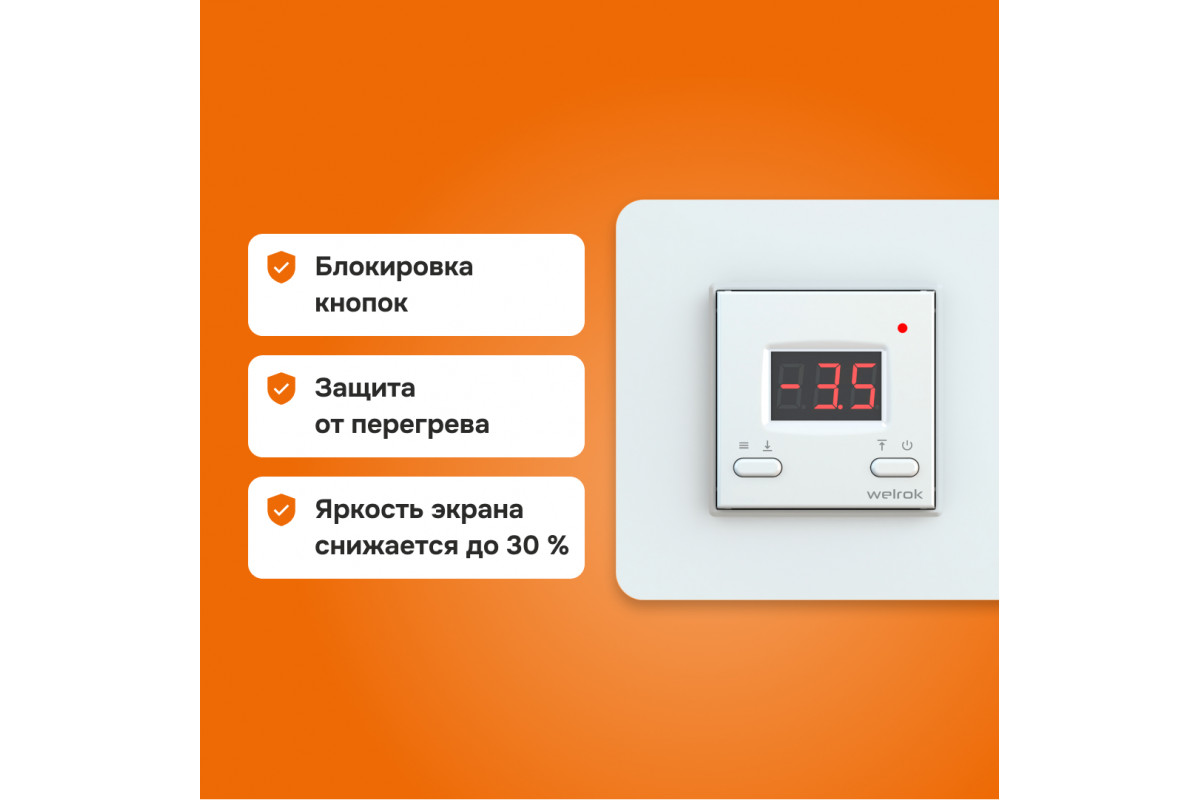 Welrok KT оснащен встроенной защитой от перегрева: при достижении температуры внутри корпуса 85 °C устройство автоматически отключает обогрев, предотвращая повреждение системы. После снижения температуры до 80 °C терморегулятор возобновляет работу, обеспечивая безопасность и долговечность оборудования.