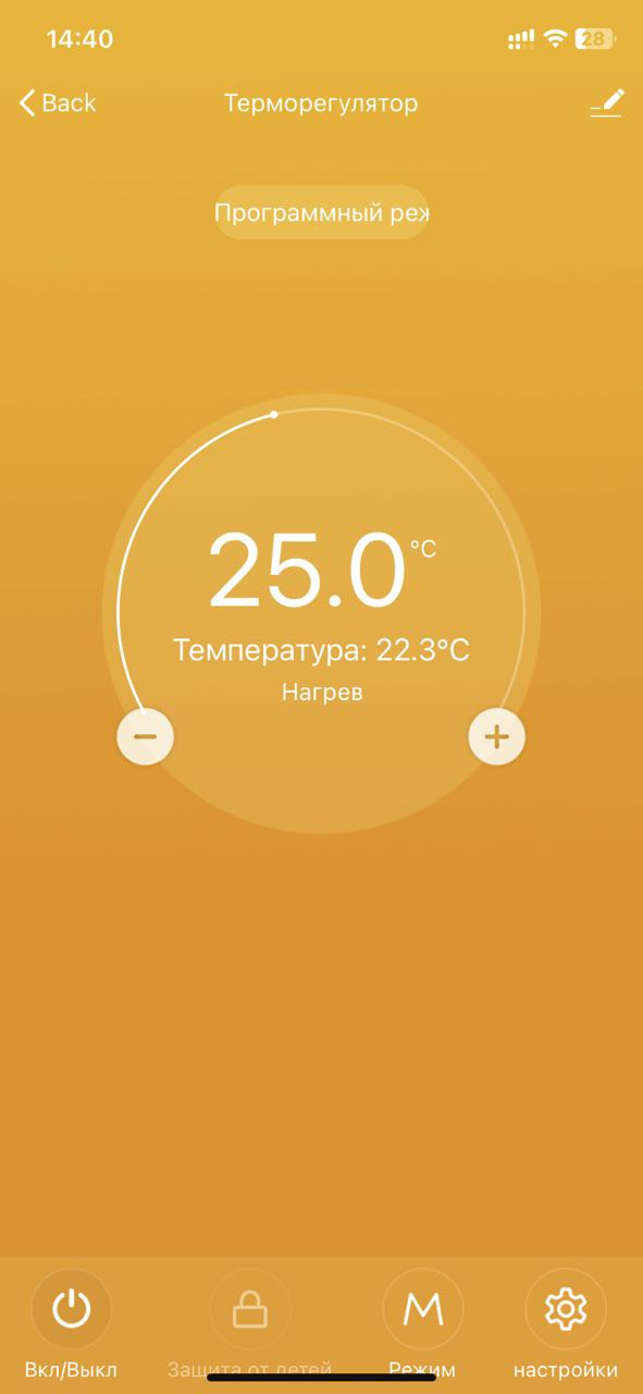 Программный режим работы заключается в следующем: мы задаем время работы регулятора по расписанию. Когда мы дома и когда нас нет. В эти временные периоды теплый пол будет либо обогревать нас либо находиться в режиме поддержания температуры. Простыми словами, пока нас нет пол отдыхает но поддерживает минимальную температуру (что бы не остыло все и не пришлось по новой прогревать), когда мы дома, все начинает работать и радовать наши ножки =) более детальная настройках есть на нашем канале.