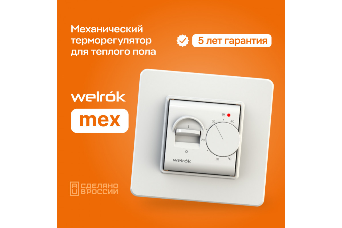 Welrok MEX — это механический терморегулятор, предназначенный для управления системами электрического тёплого пола. Он обеспечивает стабильную и комфортную температуру в помещении, позволяя пользователю легко настраивать параметры нагрева.​