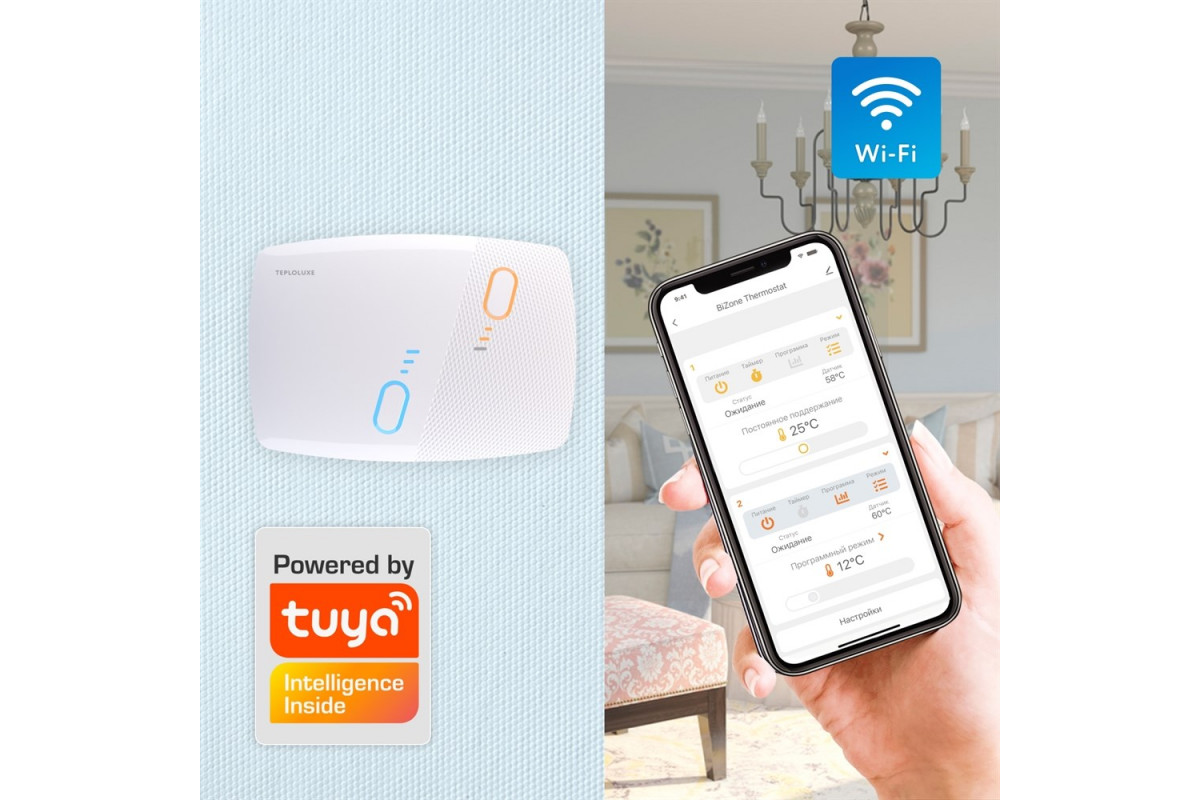 Удаленное управление обогревом пола осуществляется по сети Wi-Fi напрямую со смартфона с установленным приложением TUYA или через домашний Wi-Fi роутер (в комплект поставки не входит).