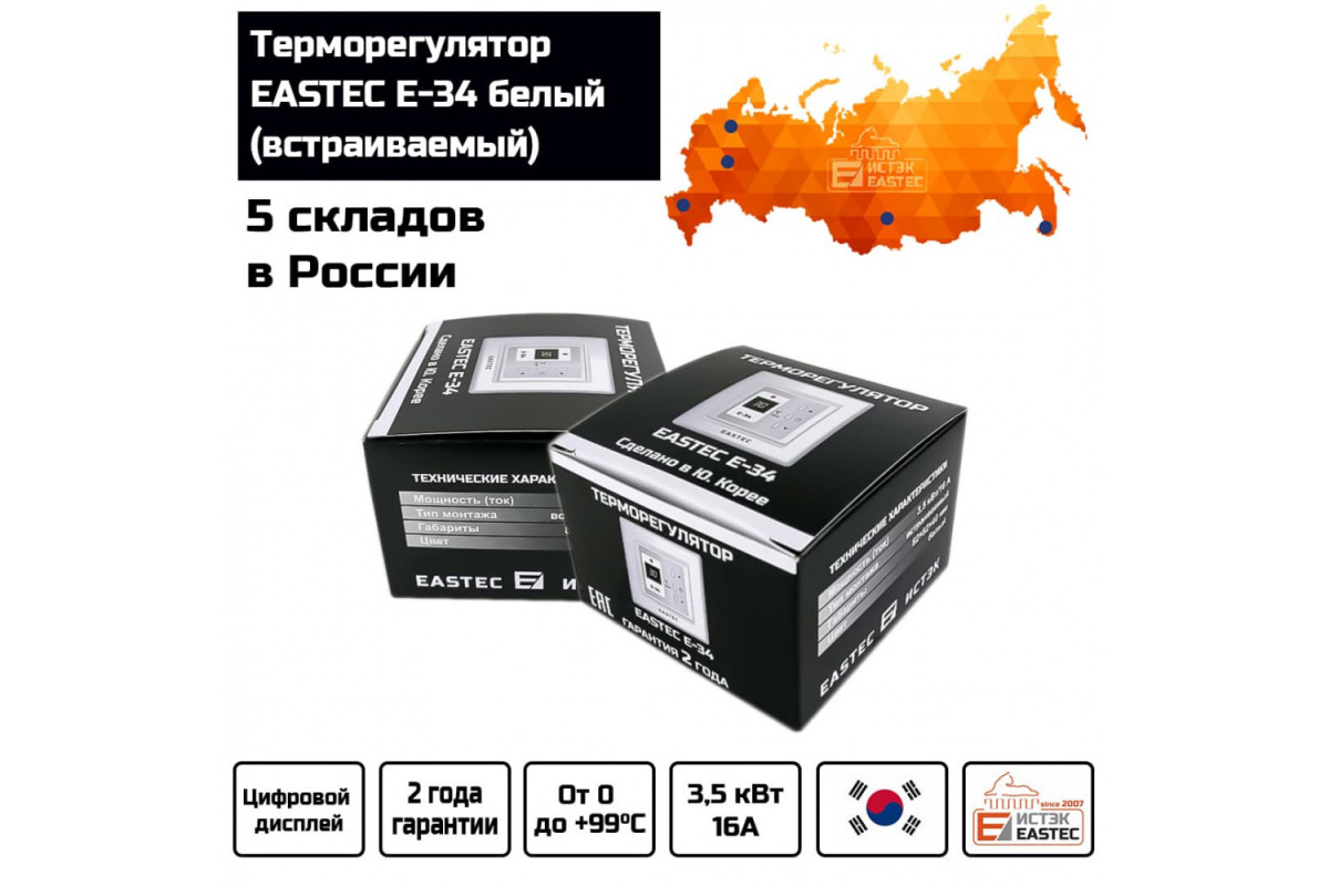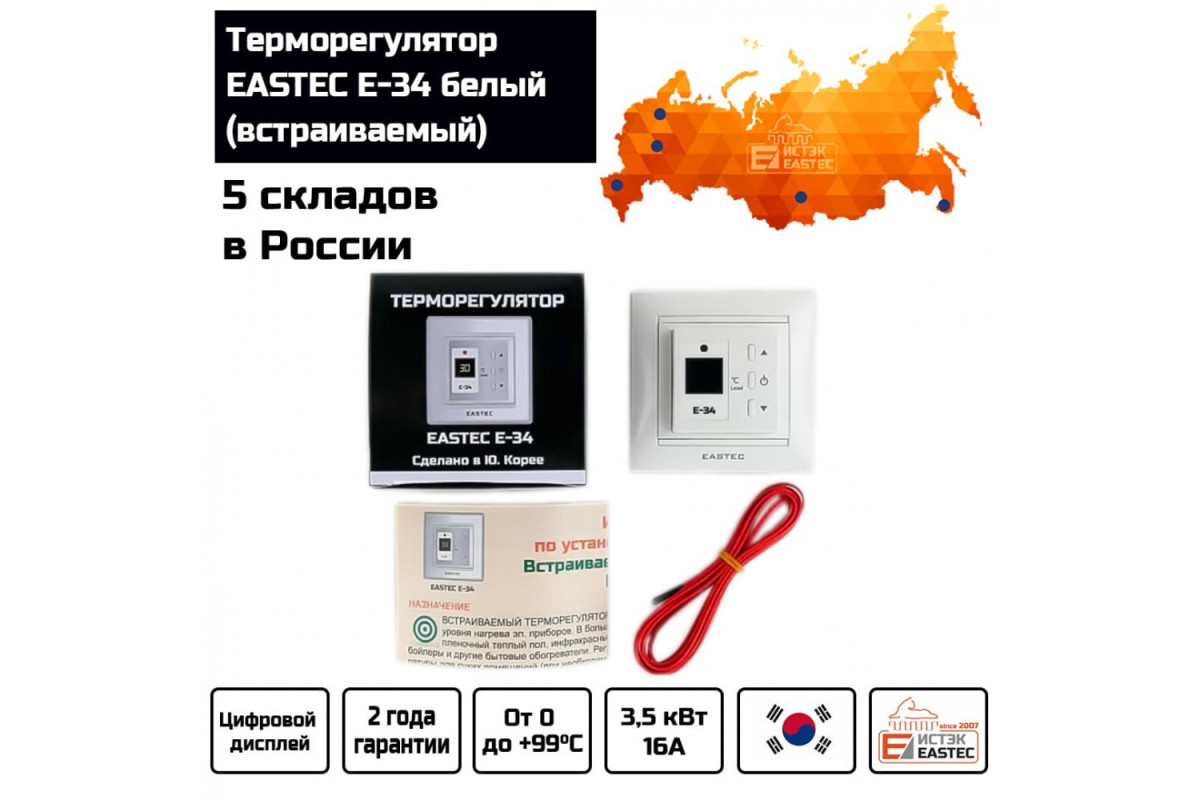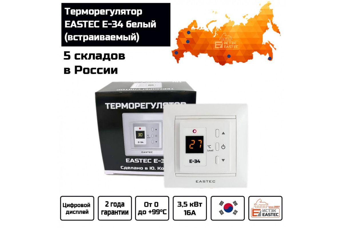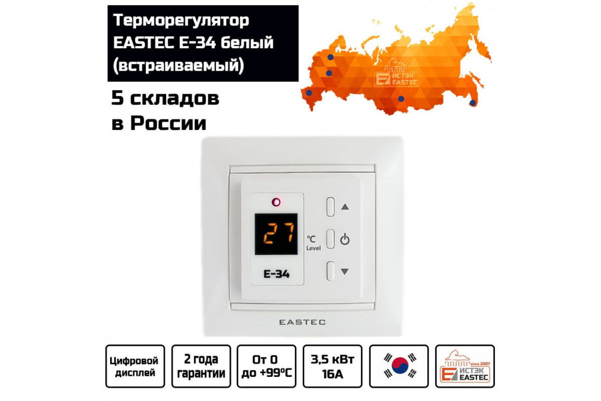 Терморегулятор EASTEC E-34 белый (встраиваемый, 3,5 кВт) — это надежное и функциональное устройство для управления системами электрического теплого пола. Он обеспечивает точный контроль температуры, повышая комфорт и энергоэффективность вашего дома.​