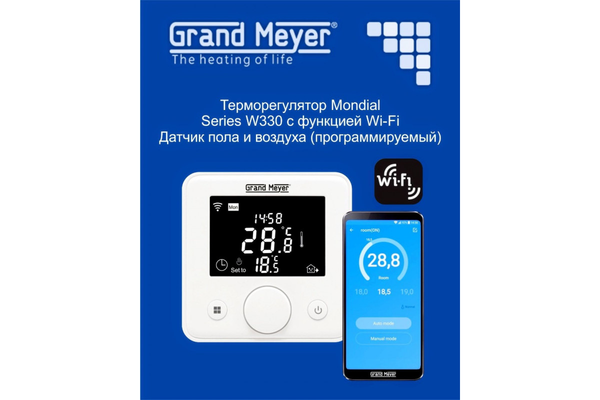 Терморегулятор Grand Meyer Mondial Series W330 Wi-Fi — программируемый терморегулятор с функцией удаленного доступа Wi-Fi для управления отоплением электрического типа.