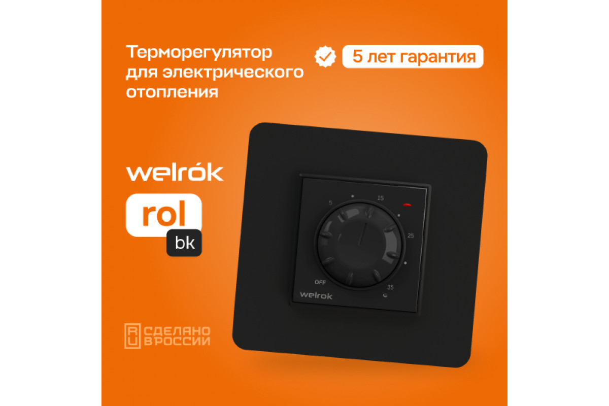 Welrok ROL BK оснащён механическим регулятором, позволяющим легко устанавливать желаемую температуру в диапазоне от 0 до 35 °C. Встроенный датчик воздуха обеспечивает точное измерение температуры, поддерживая комфортный микроклимат в помещении.​