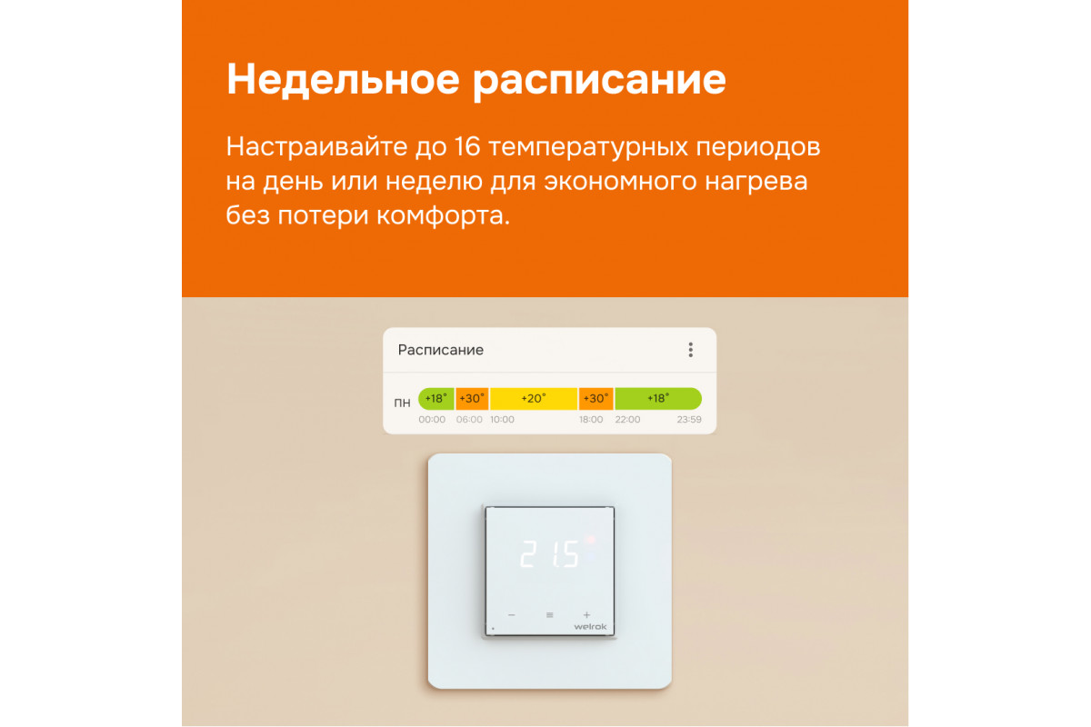 С помощью фирменного приложения Welrok, доступного в Google Play и App Store, вы можете управлять обогревом из любой точки мира. Функция геозонирования автоматически снижает температуру, когда вы покидаете дом, и восстанавливает комфортный режим при возвращении, что способствует экономии энергии. ​