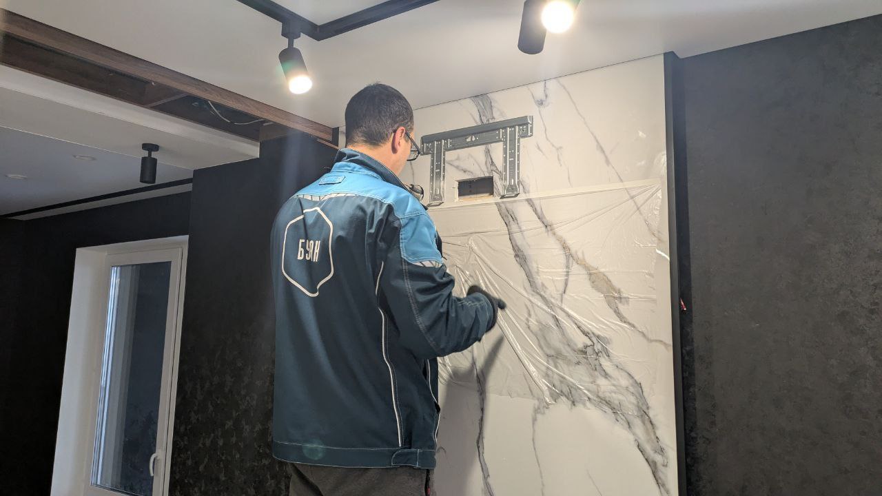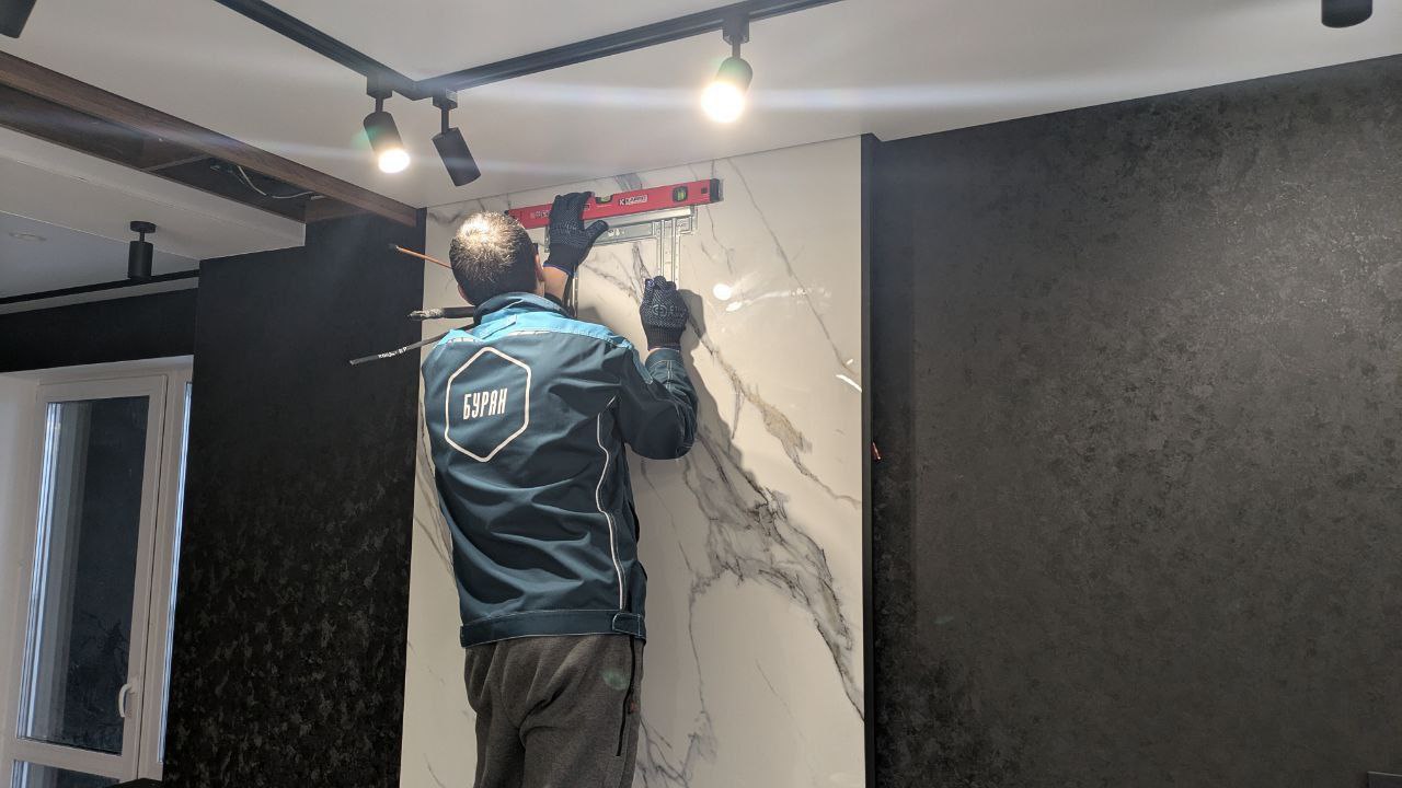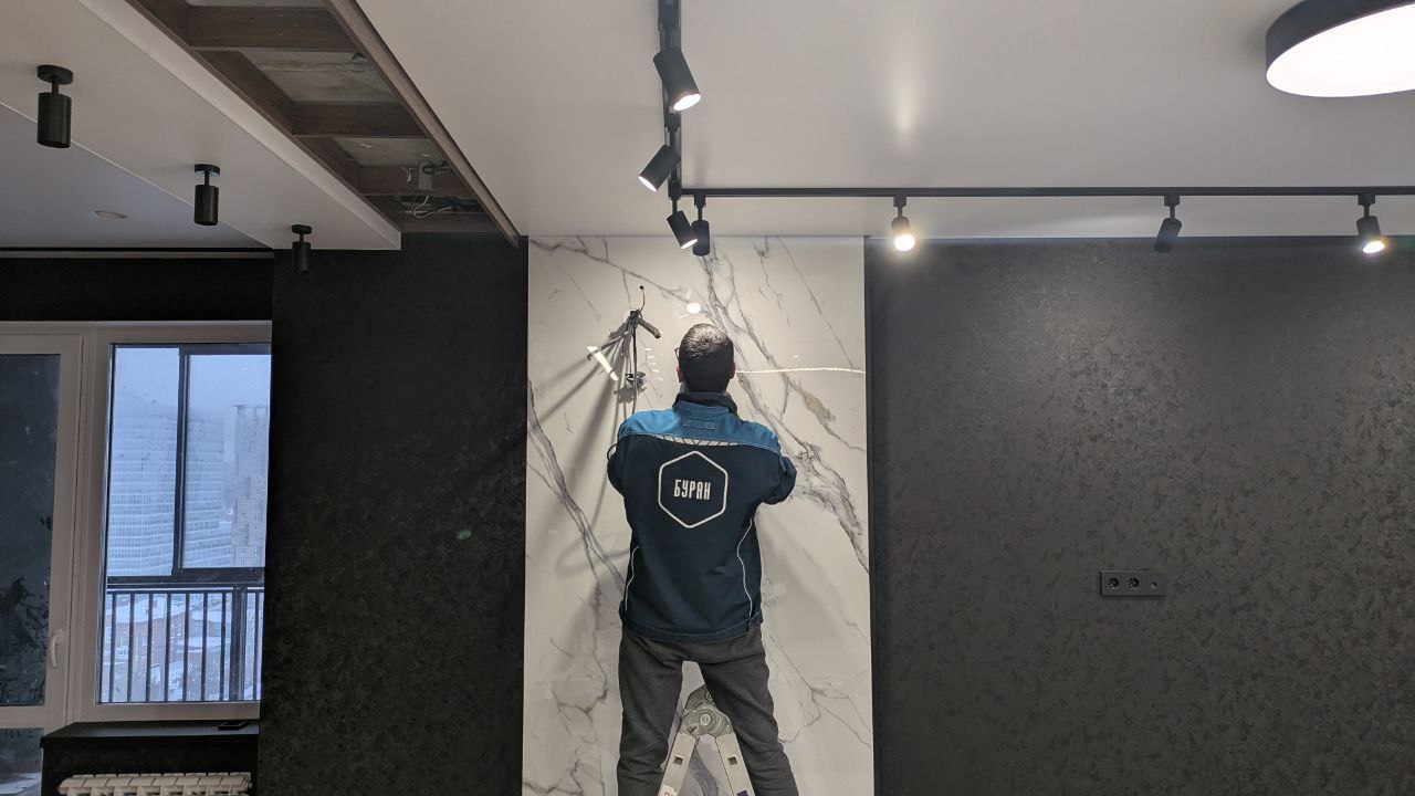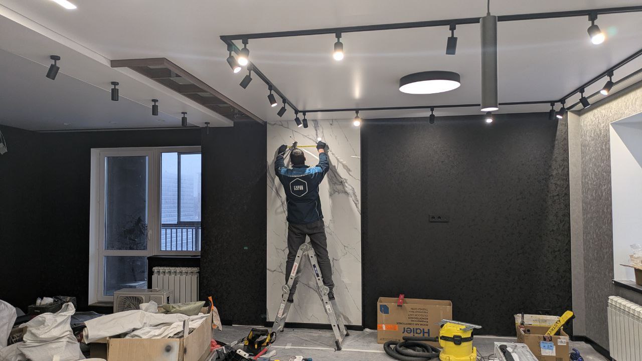 Работа началась с подготовки. На этапе ремонта бригада из Томска в составе Алексея и Антона выполнила закладку трассы для будущего монтажа кондиционера. Это важный этап, который позволяет интегрировать систему кондиционирования без нарушения эстетики интерьера.