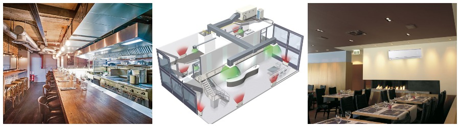 • В ресторанах часто используют системы воздуховодов, по которым распространяется прохладный воздух. Особенно важна система подмеса свежего воздуха, которая может быть необходима для обеспечения комфортной атмосферы в заведениях общественного питания.